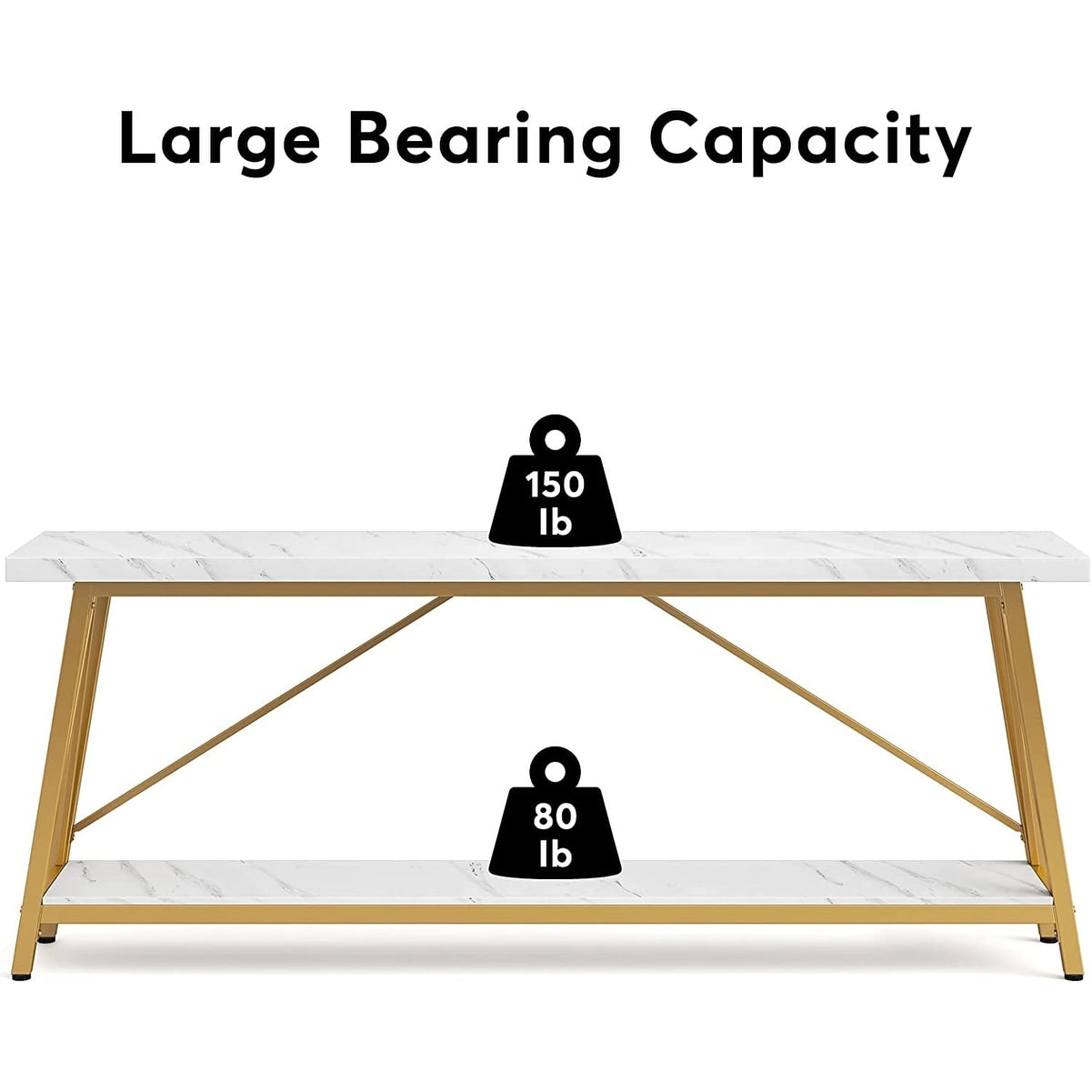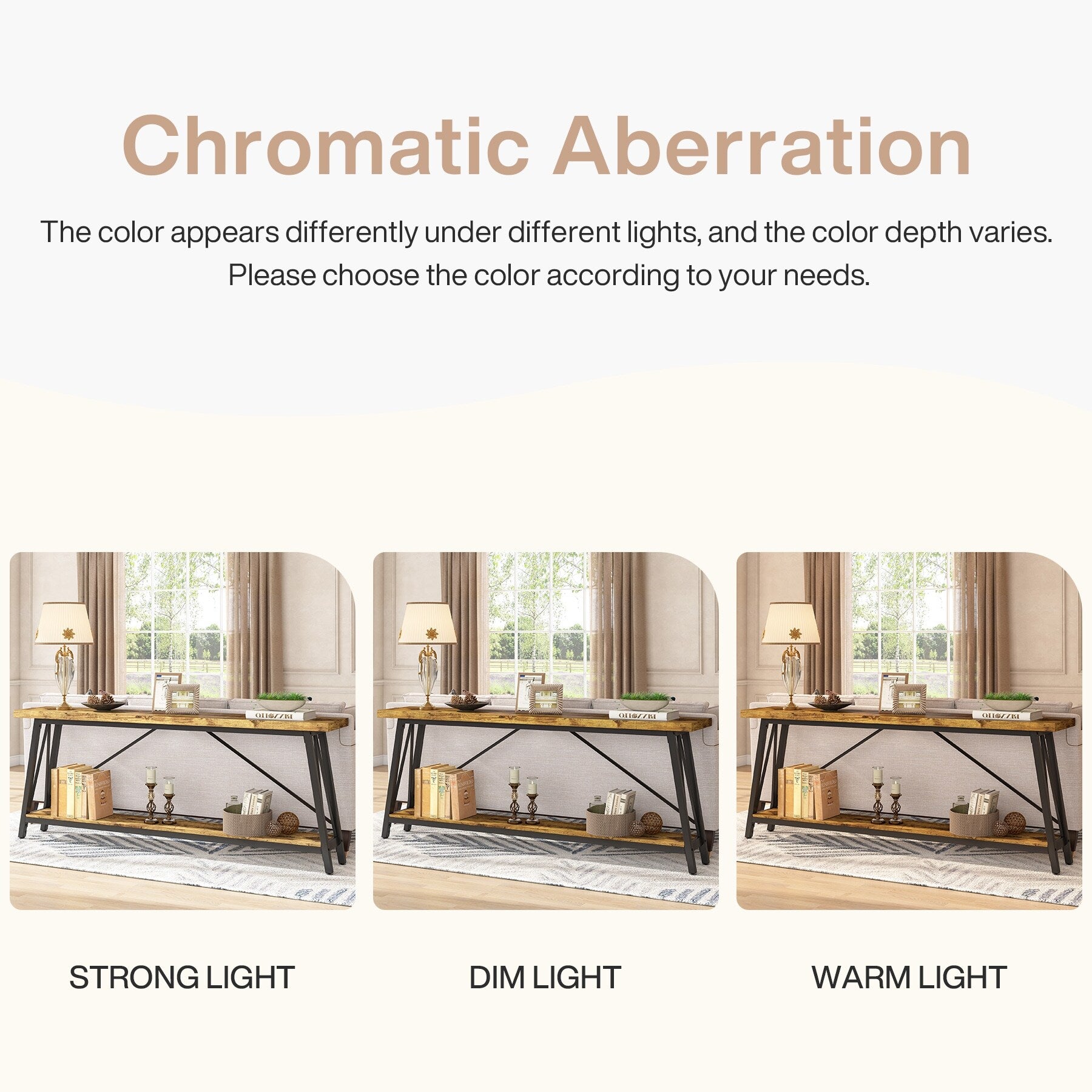 Add a touch of rustic industrial style to your living room or hallway with this classic 70.9 inch extra long sofa table. Its 2-tier shelves provide ample storage space to display your favorite books, framed photos, or artwork. The sturdy triangular structure and thick metal legs ensure a strong bearing capacity of up to 230 pounds, while adjustable leg pads keep the table level on uneven ground. Assembly is easy with the marked parts and included instructions.