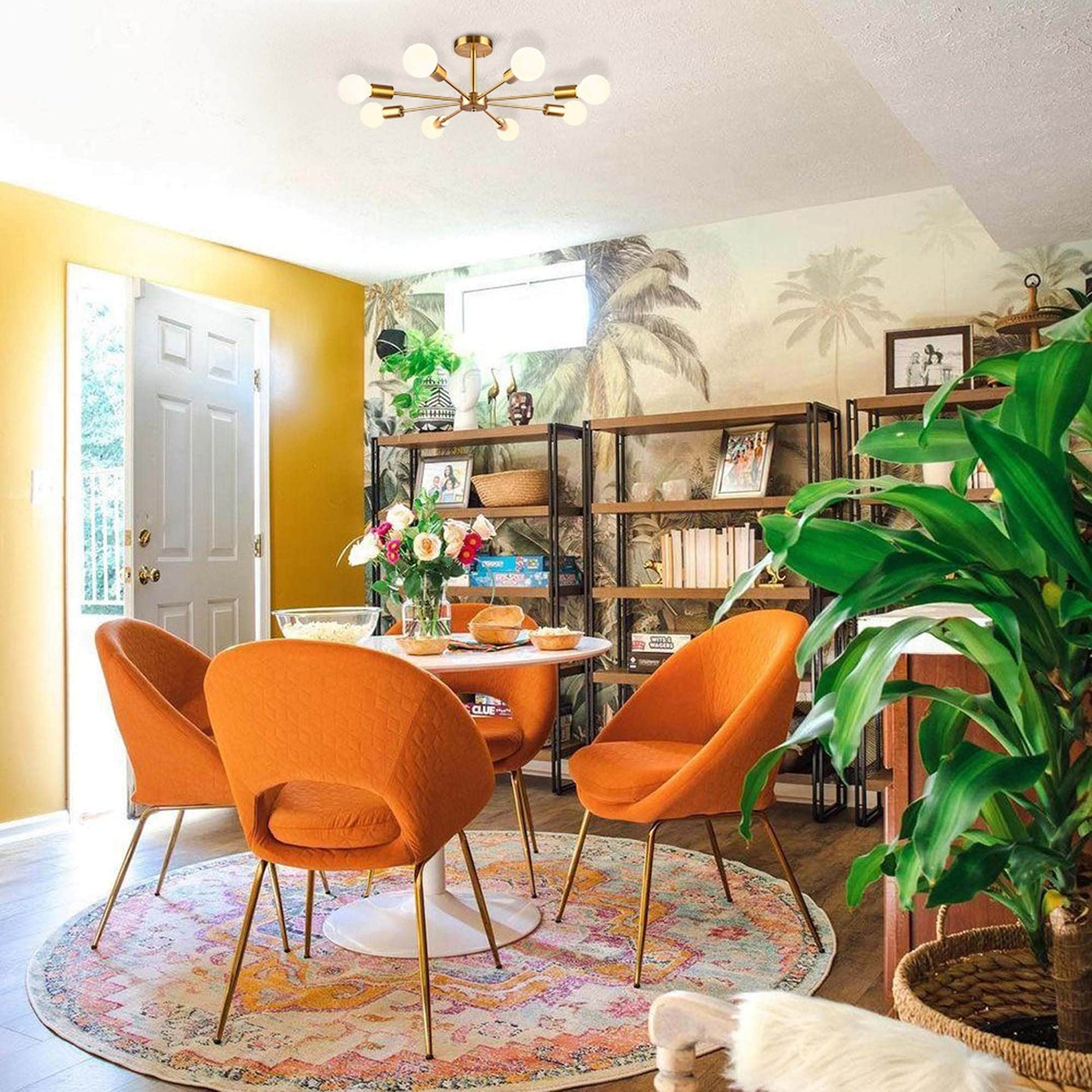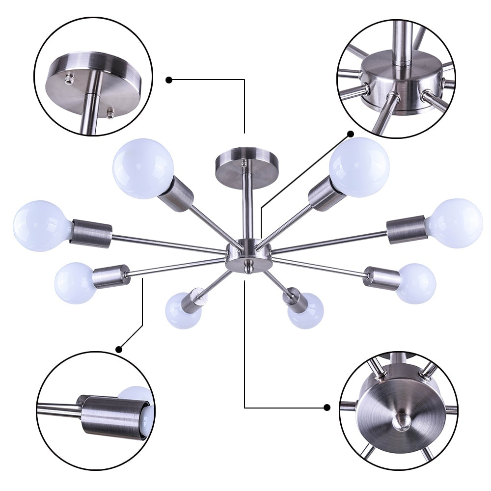 Bring a touch of nostalgia and retro flair to your living space with this Modern Vintage Glam Metal Sputnik Semi-Flush Mount Ceiling Light by RRTYO. Its sputnik design with equidistant arms and exposed bulbs is a perfect blend of old-world charm and modern aesthetics, making it an ideal lighting option for any setting. Choose from gold, black, nickel, or black with brass finishes to match your decor. Enjoy easy installation with included assembly and installation parts, and customize the brightness and intensity with a compatible dimmer switch or dimmable bulbs (not included).