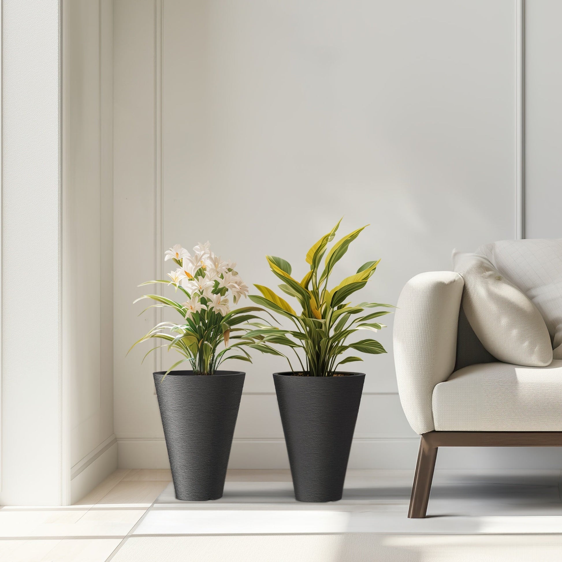 Black Tall Plastic Round Plant Pots / Large Indoor and Outdoor Flower Planters, 2 Piece Set