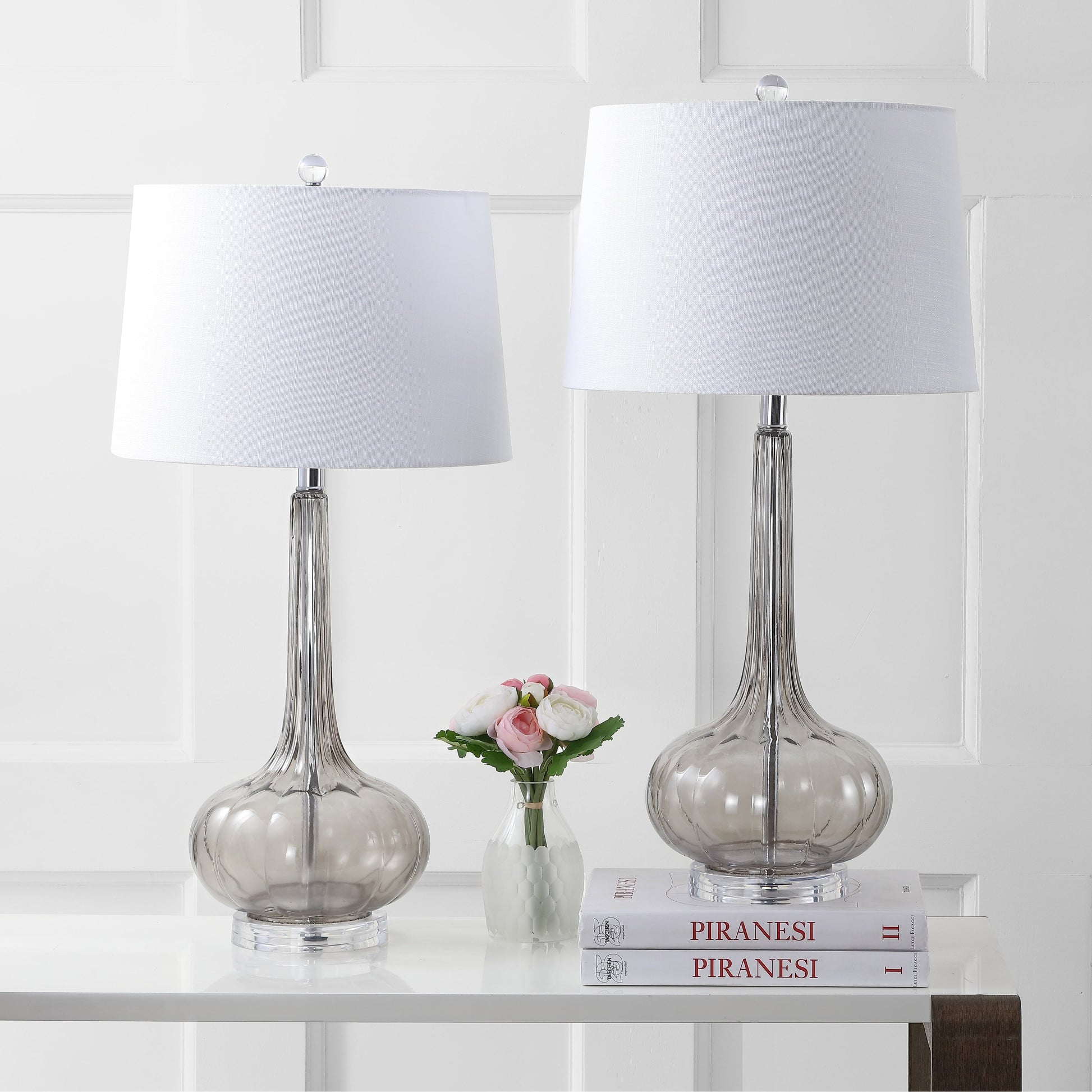 Add a pop of color to any room with this set of two Diamante 28.5' Glass Teardrop LED Table Lamps in pink by JONATHAN Y. The classic glass style and oversized drum shade make these lamps a versatile choice for any space. Perfect for bedside reading or as statement pieces on a console, the lamps feature a silk-wrapped cord and eco-friendly LED bulbs.