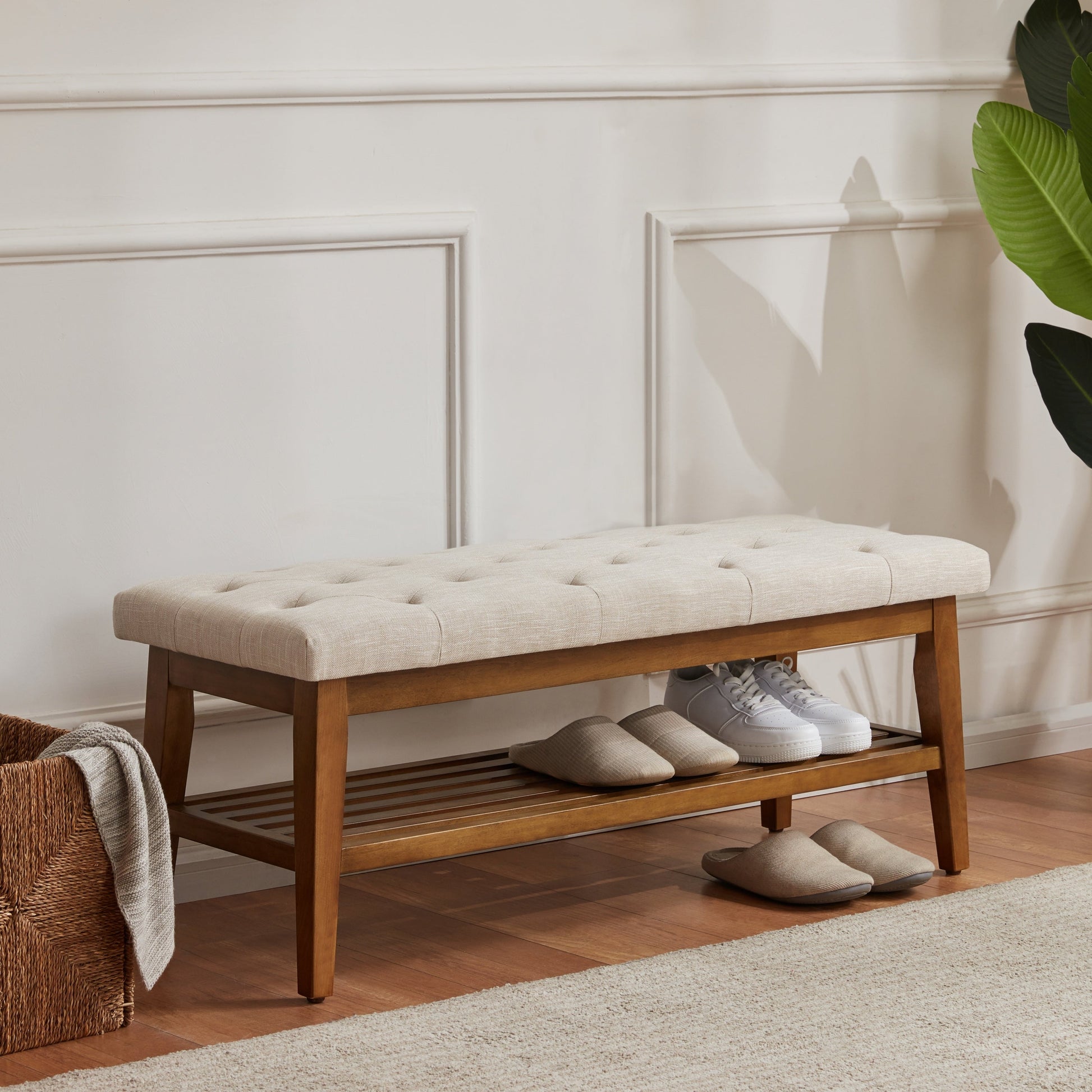 Entryway Shoe Bench Storage Bench Fabric Solid Wood, 43-inch Upholstered Bench for Living Room, Bedrooms