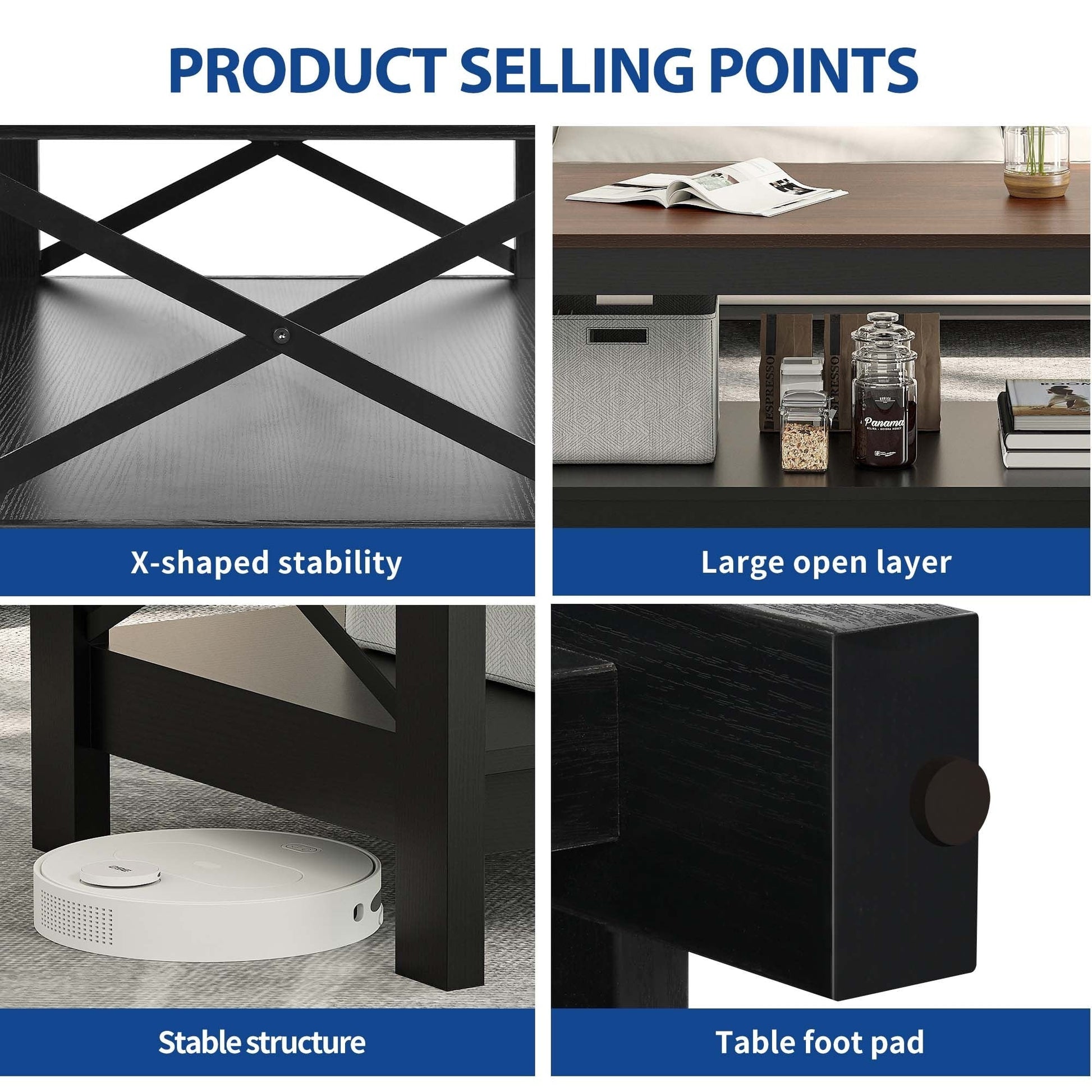- 3. Unique X-Shaped Side Design: Our coffee table features a unique X-shaped side design that adds an extra touch of style and elegance to your living room. Modern coffee table is made of thick planks and can hold up to 180 pounds.