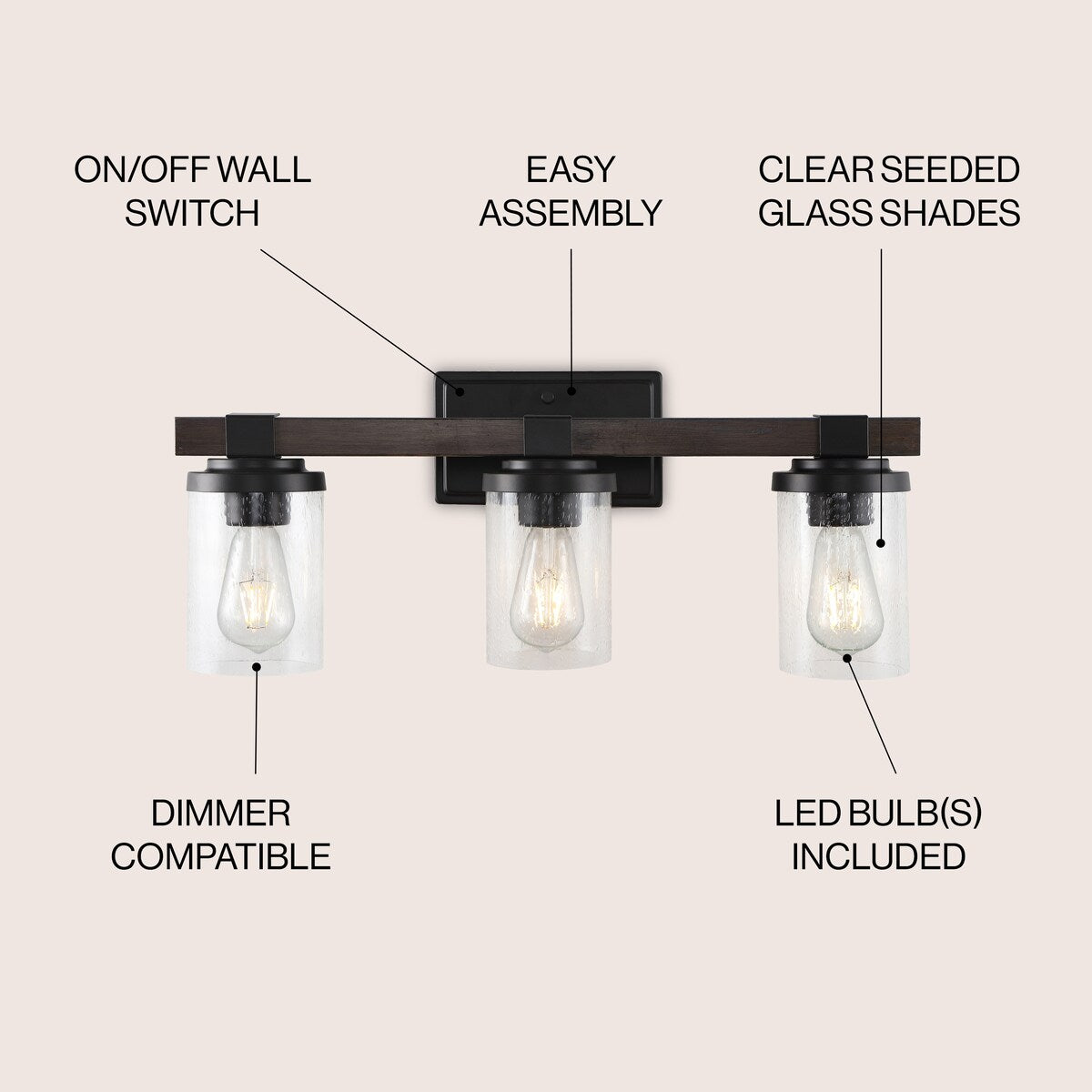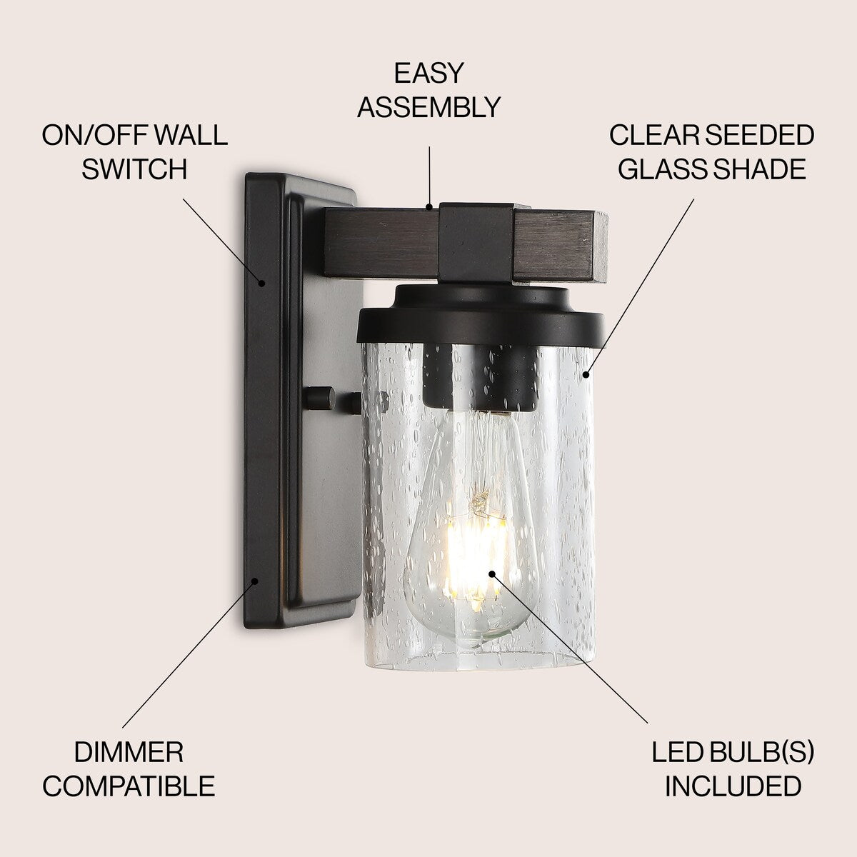 Ferme Iron/Seeded Glass Rustic Farmhouse LED Vanity Light, by JONATHAN Y