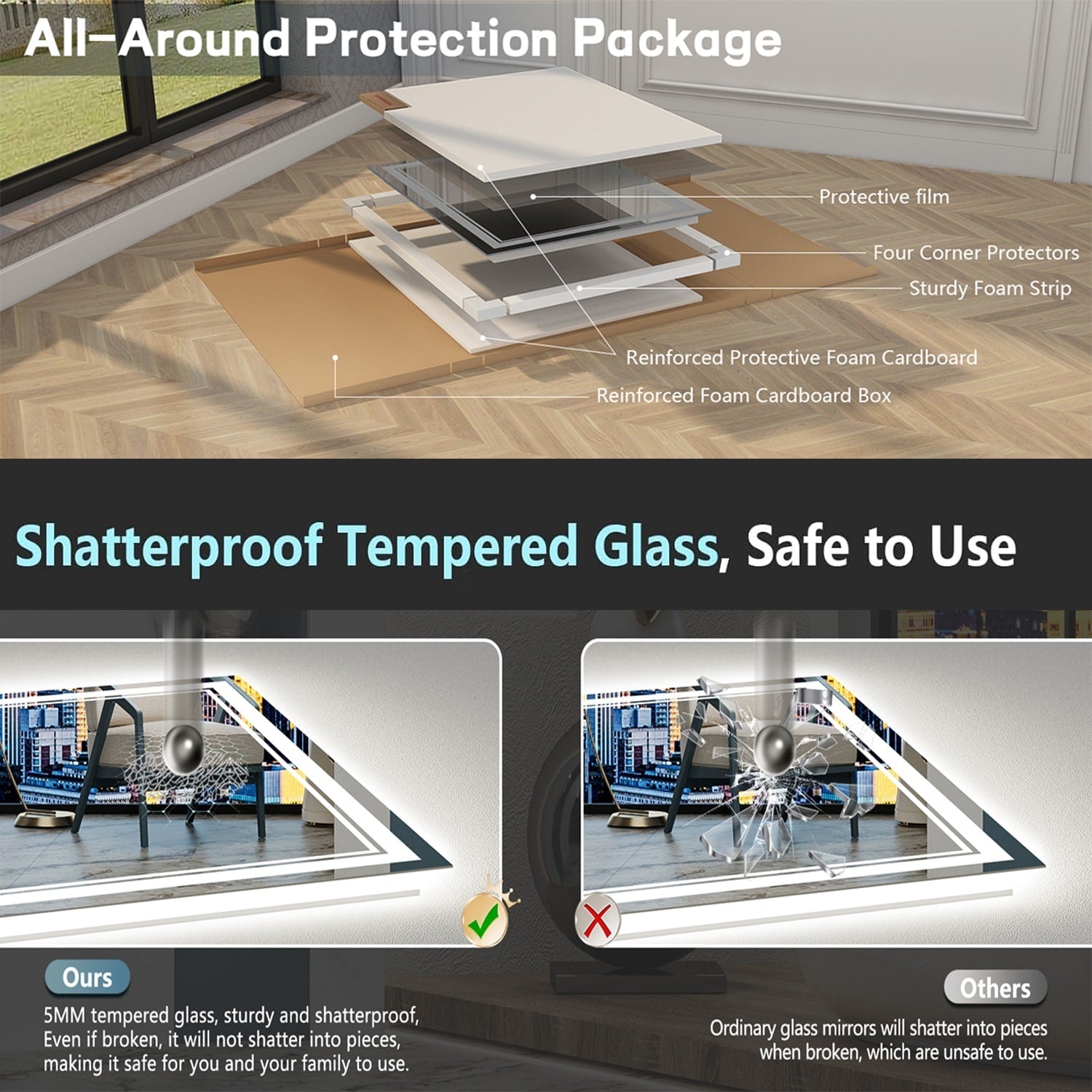 - Material: 5MM Tempered Glass & HD Copper-free Silver Mirror