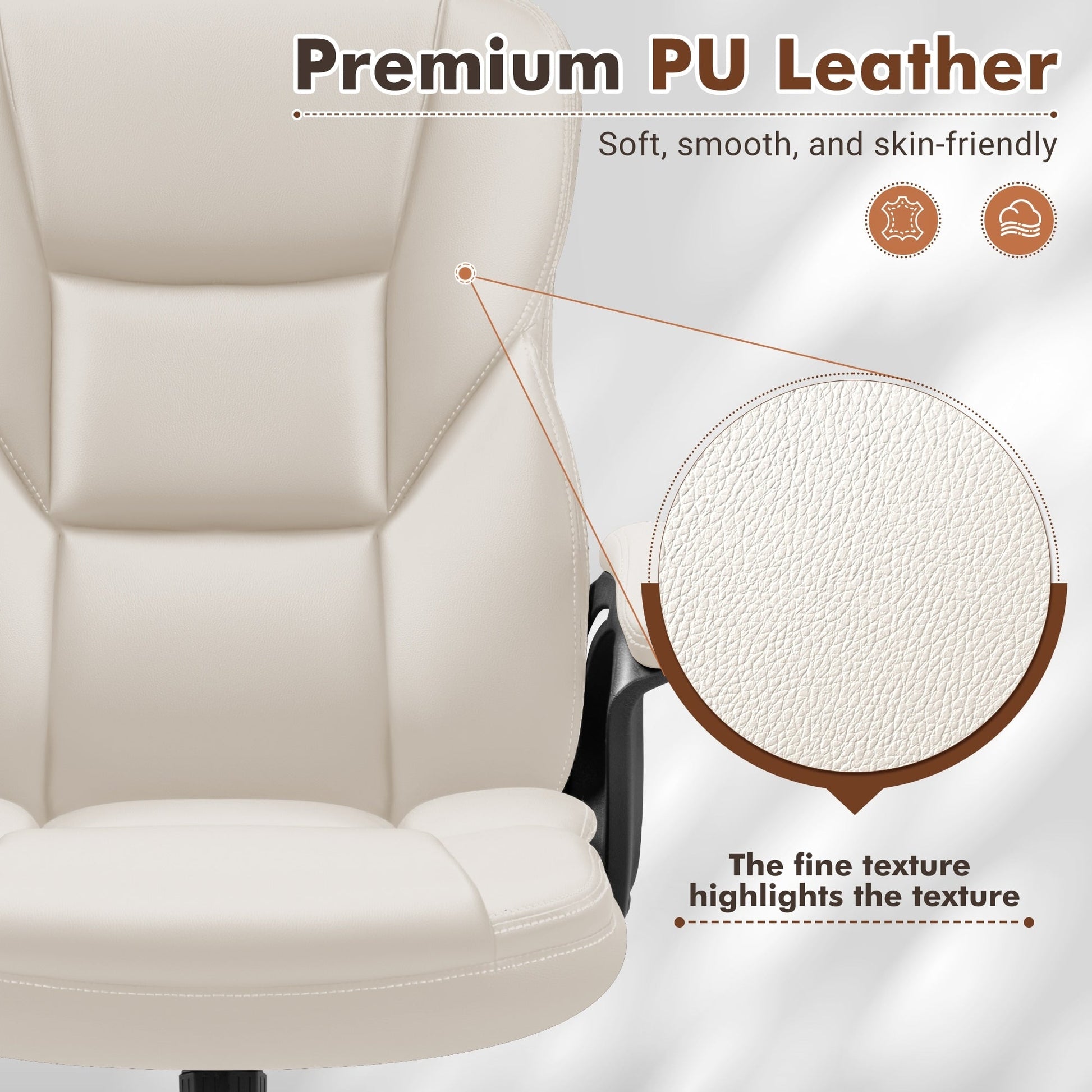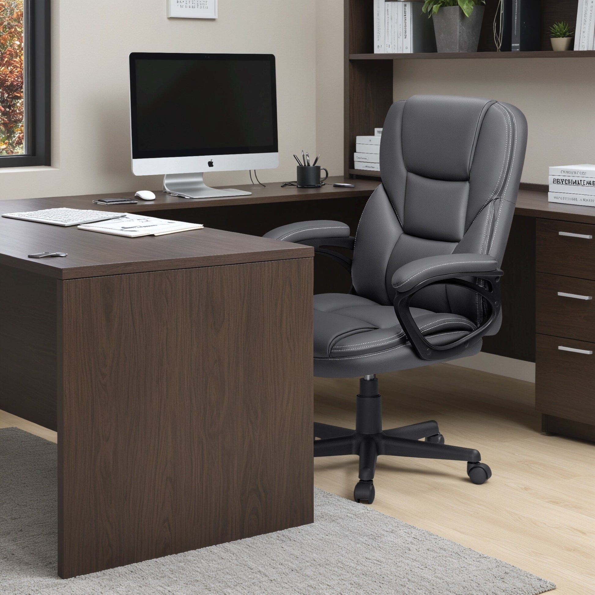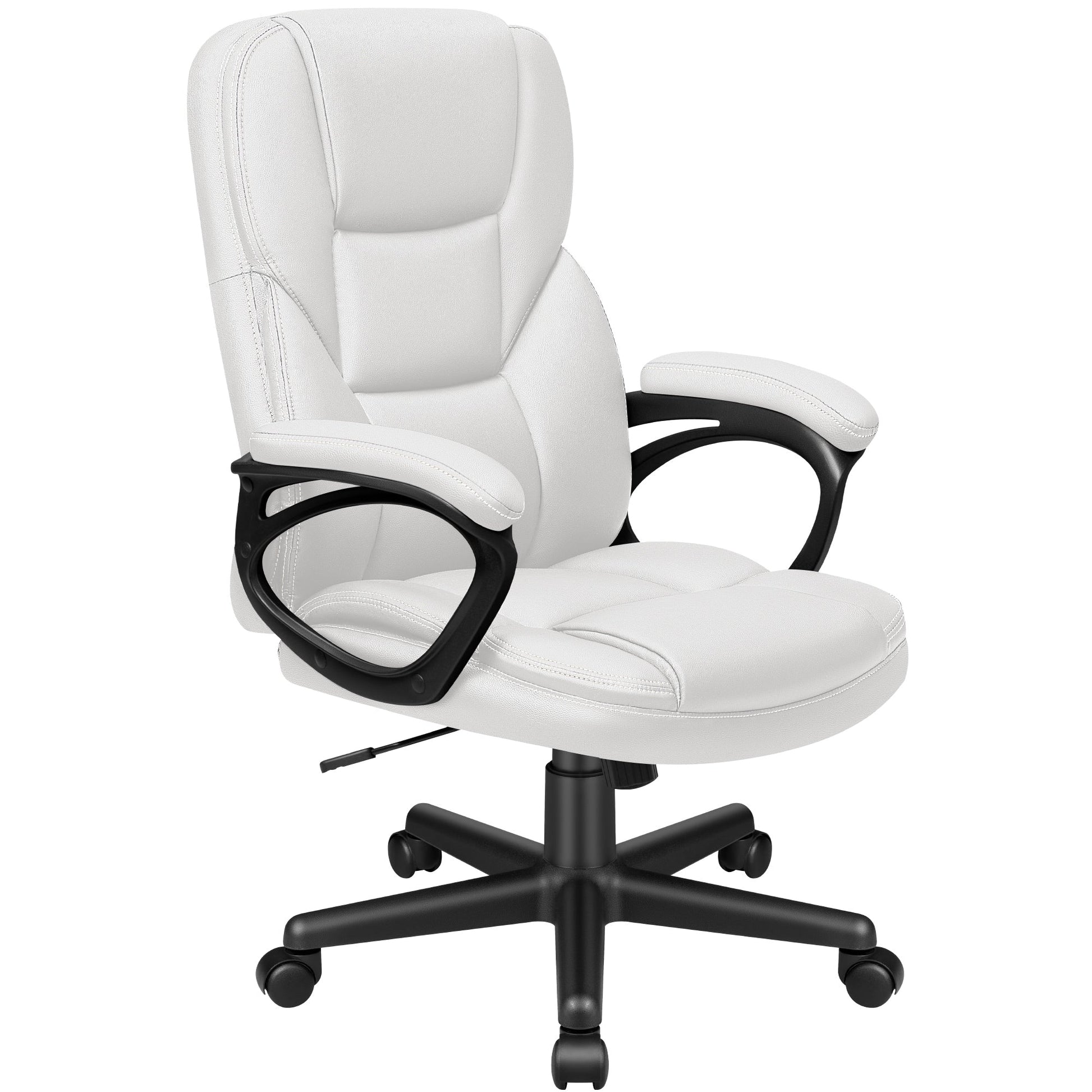 Work comfortably while sitting in this executive ergonomic computer chair. This chair has a cushioned back and upholstered seat that provides extra support. It features thick padding and soft texture. A 360-degree swivel, heavy-duty base and smooth-rolling casters make a superb stable structure.