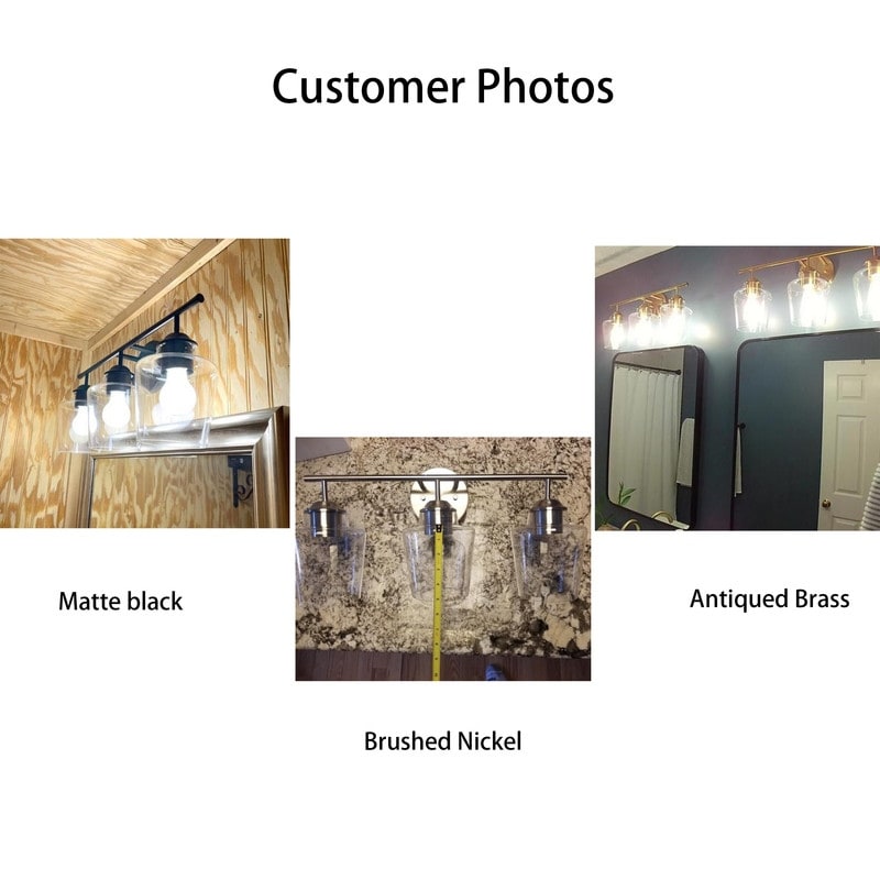 Featuring four clear hand-blown glass shades in a goblet shape, this vanity light is mounted on a sturdy iron frame. Finish in a choice of black, antique brass, and brushed nickel provides options for different styles of décor. Its sockets are compatible with a dimmer switch, allowing you to adjust the brightness to your preference. This versatile fixture can be mounted facing upwards or downwards.
