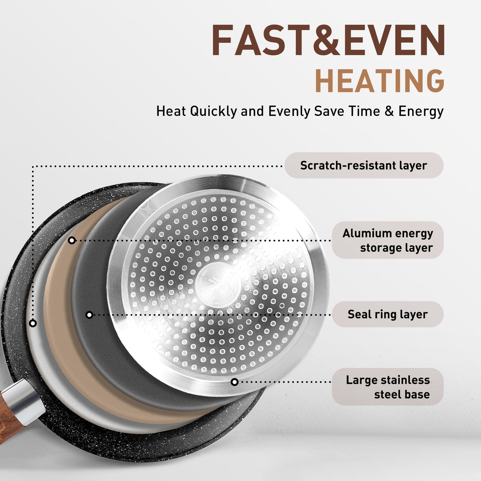 Toxin-free Cooking Set: When buying a new set, make sure that it clearly indicates that it is lead, PFOS, and PFOA-free. These are the three things that you don't want to have in your cookware because of their potential health dangers. Fortunately, you can get granite cookware that is free of these harmful chemicals. For more healthy & Eco-friendly.Induction Cookware Sets: When it comes to the interior, this cookware uses an aluminum core. The result is that the pan heats up quickly, and more importantly, distributes heat evenly. The cookware set works on all major types of cooktops. Larger high-magnetic conductive stainless steel bases ensure induction compatibility, especially glass stoves.