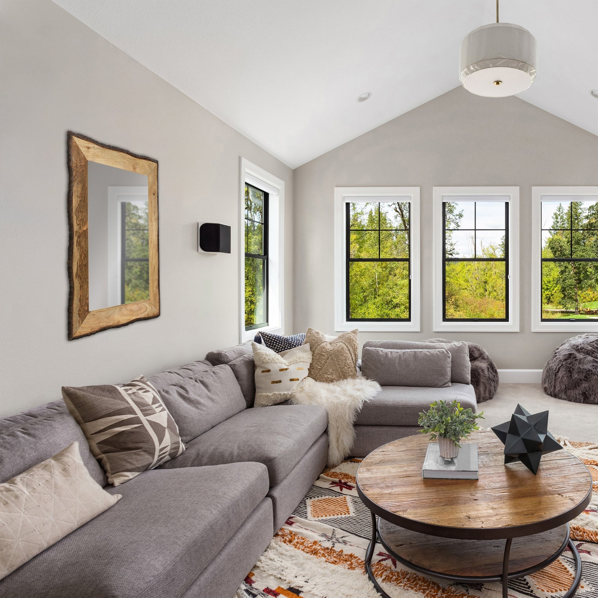 - Features 2-tone wooden frame and reflective glass