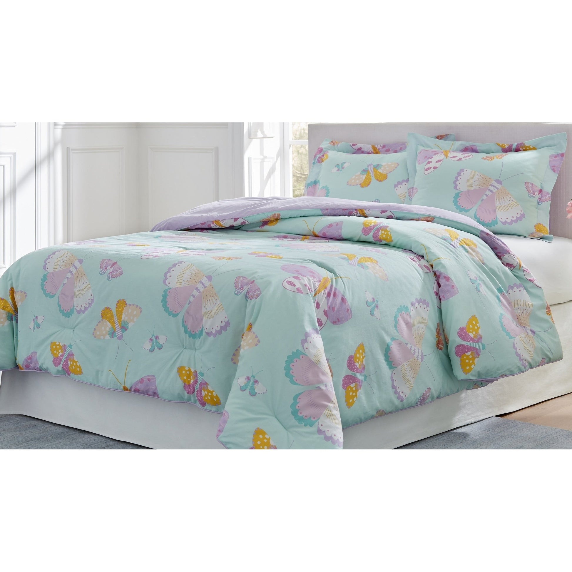 Experience the perfect blend of durability and softness with Lullaby Bedding Butterfly Fairy Cotton Luxury Comforter Set. Featuring a beautiful butterfly fairy design, the comforter and shams have a cotton exterior and a polyester fill that ensure comfort and longevity. Reversible solid colors allow you to switch up the look of your bedding with ease. The machine-washable fabric and the blend of cool tones facilitate easy care and a relaxing ambiance.