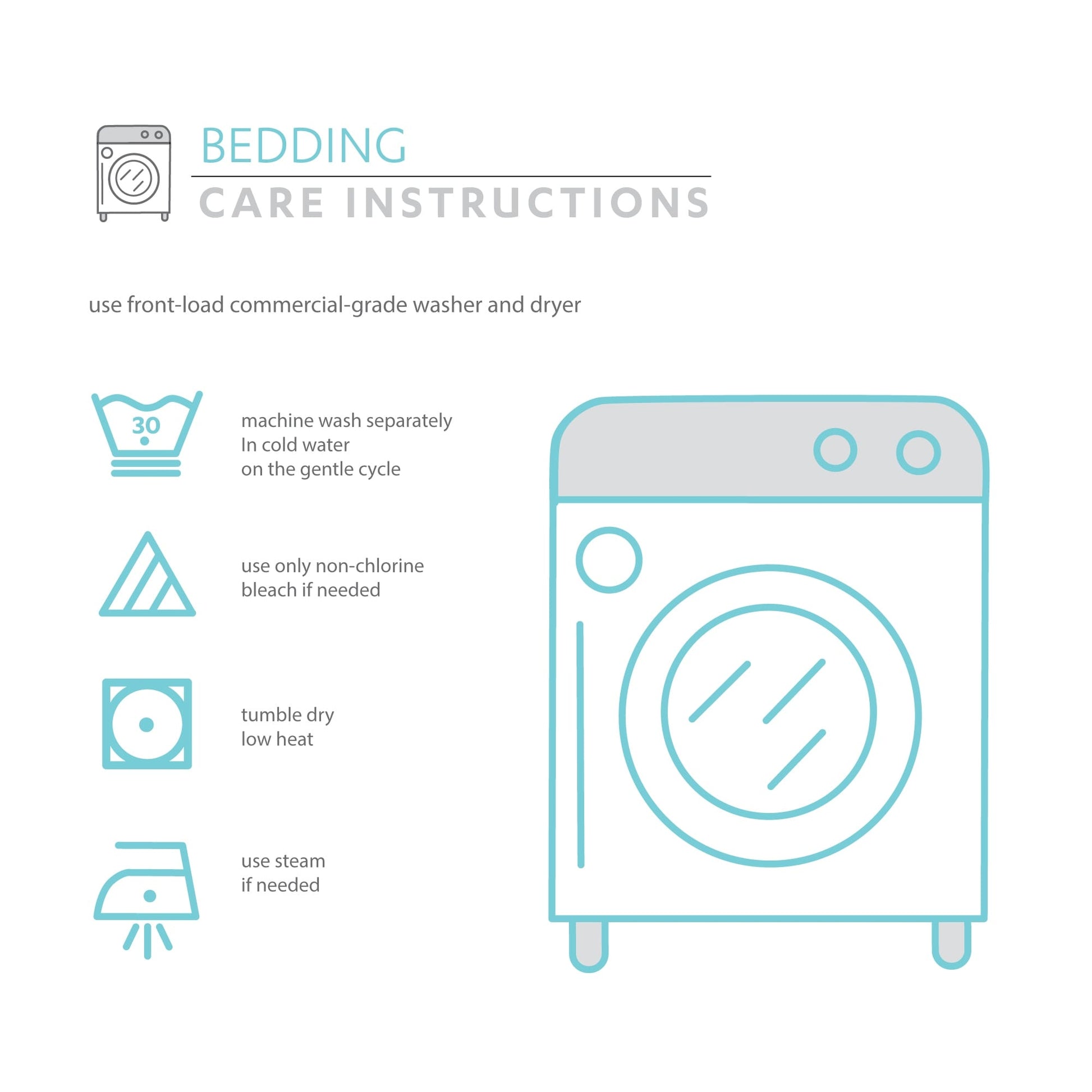 - Use Front-Load Commercial Grade Washer And Dryer. Machine Wash Separately in Cold Water on the Gentle Cycle. Use Only Non-Chlorine Bleach If Needed.