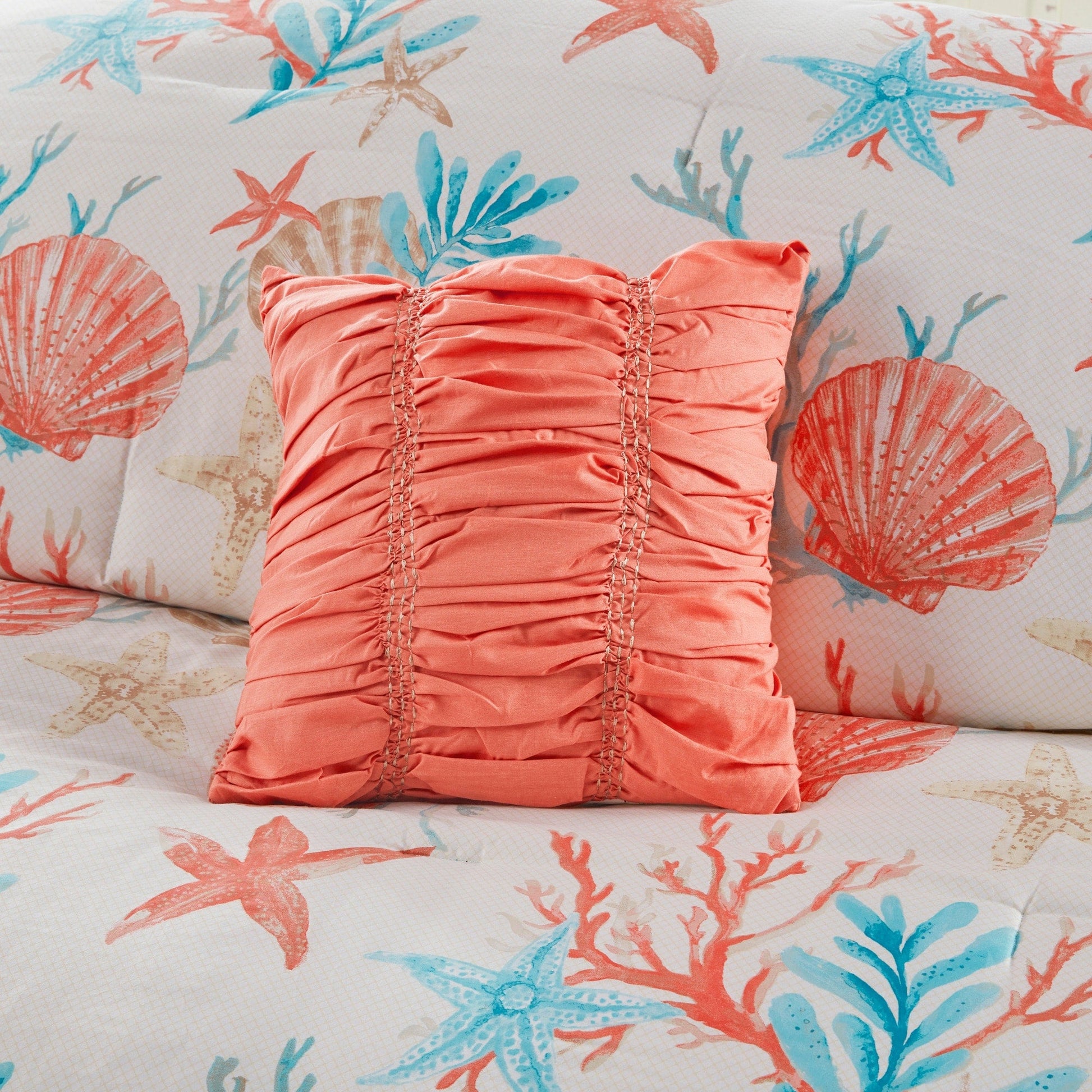 For a vibrant coastal update to your bedroom, the Madison Park Pacific Grove 7 Piece Cotton Sateen Comforter Set is perfect for you! This coastal comforter features all-over printed shells, starfish, and coral in vivid colors to brighten your space. The soft cotton/polyester reverse is a solid color that complements the coastal design. The 2 matching shams beautifully coordinate with the cotton comforter, completing the coastal look. Also included are 3 decorative pillows with coastal embroidery details that add dimension to the top of the bed, while a solid bed skirt adds the finishing touch. Hypoallergenic polyester filling in the comforter and decorative pillows are treated to be dustproof and contain no allergens. This cotton comforter set is OEKO-TEX certified, meaning it does not contain any harmful substances or chemicals to ensure quality comfort and wellness. Machine washable for easy care, this casual bedding set may come in rolled or compressed packing and will need to be fluffed up. Use a steam iron to help remove wrinkles easier.