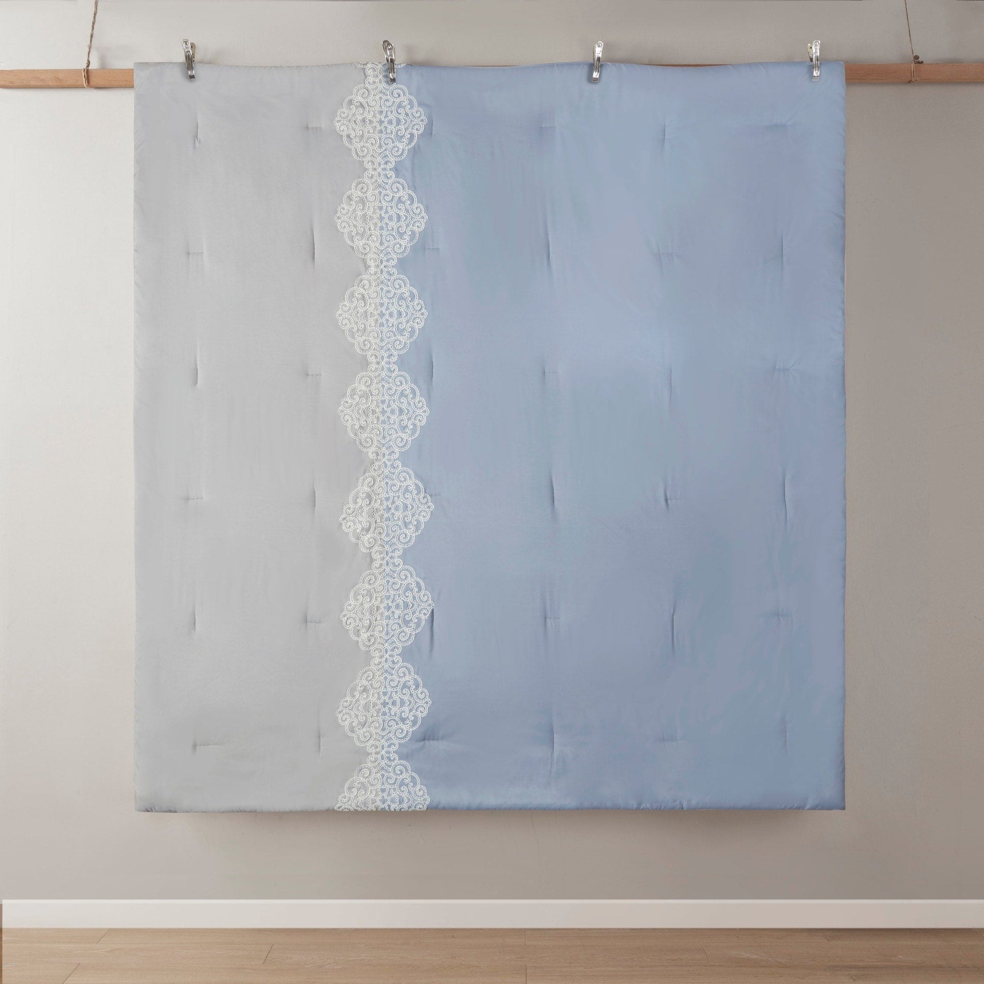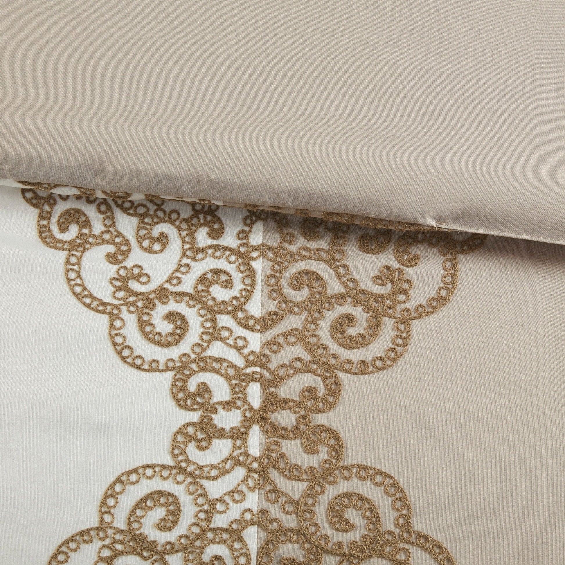 Elegance and glam are brought together in the beautiful transitional design of this luxury comforter set. Soft calming colors are accented by coordinating floral embroidery to create an understated and charming look.