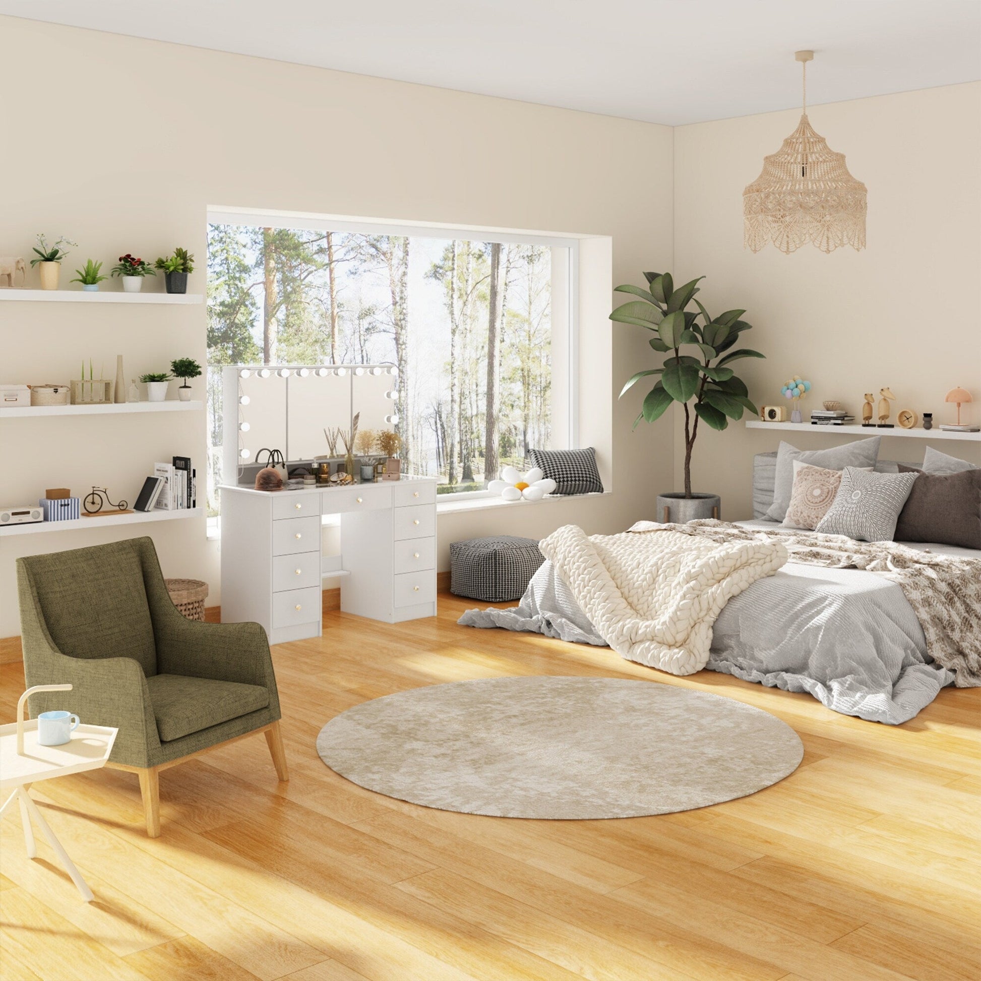 Makeup Vanity w/Tri-Fold Mirror Certified Lighting Glass Top Dresser