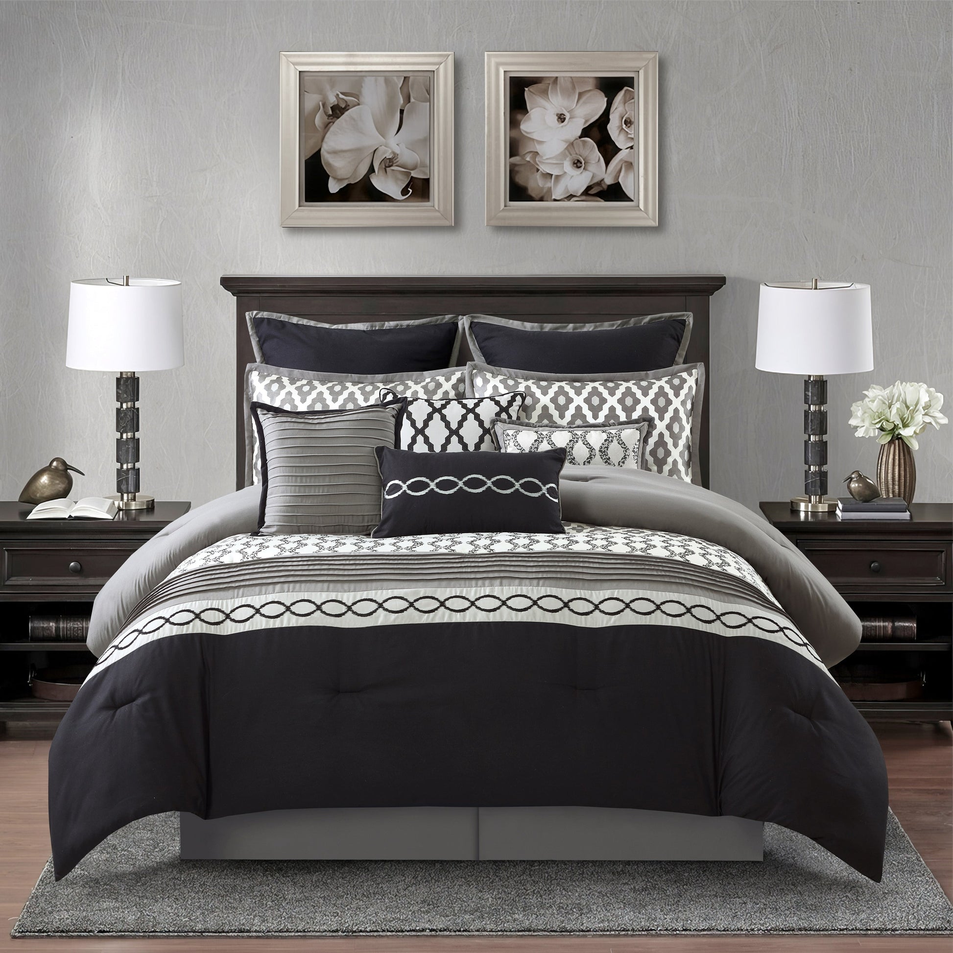 - 10-piece set including comforter, bedskirt, shams, euro shams, and decorative pillows