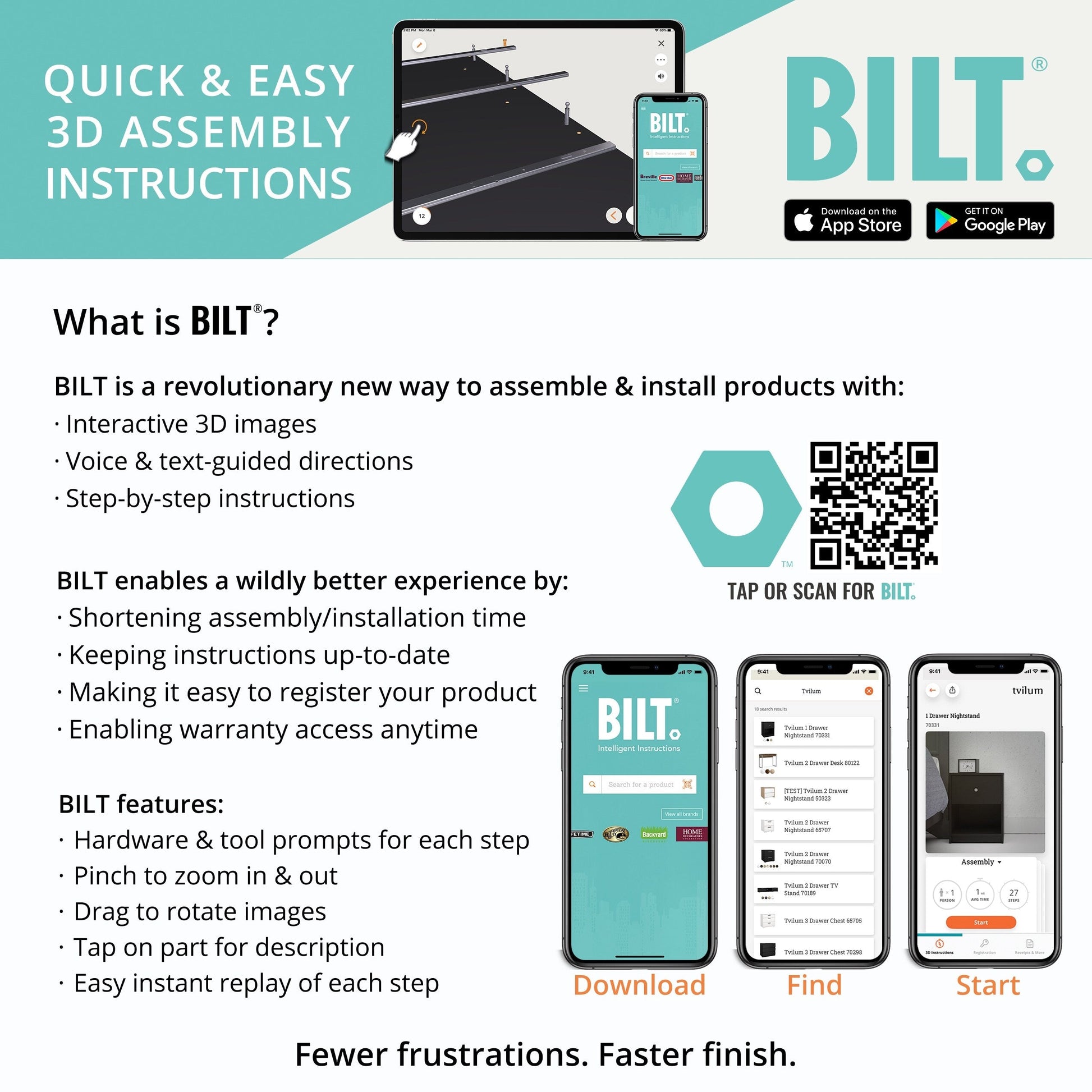 - 3D Interactive assembly through BILT: Instructions for this product are available through the free BILT app. Find a revolutionary way to assemble & install product with voice, text, & interactive animated images
