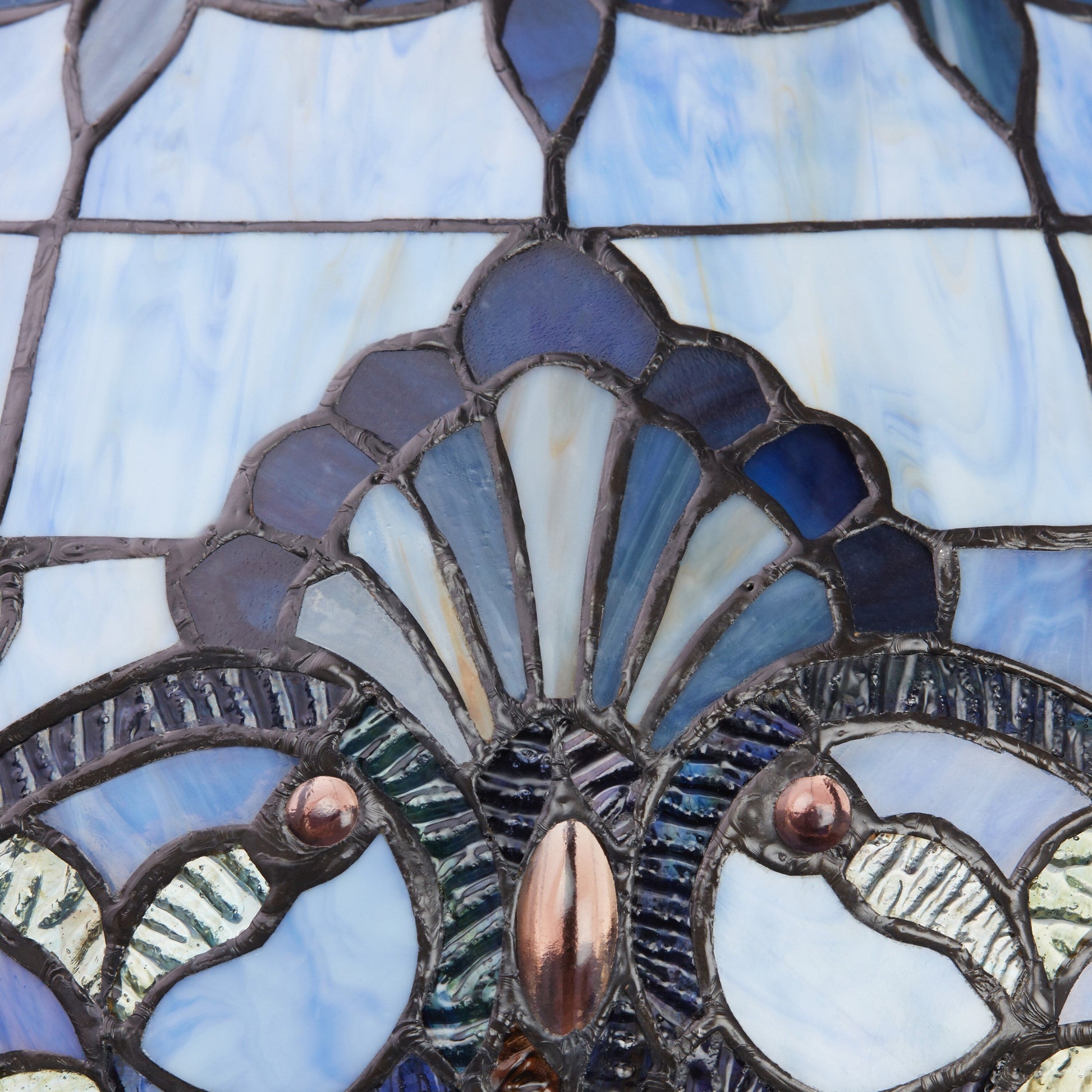 - Shade crafted from 372 pieces of striated blue stained glass and 51 cabochons