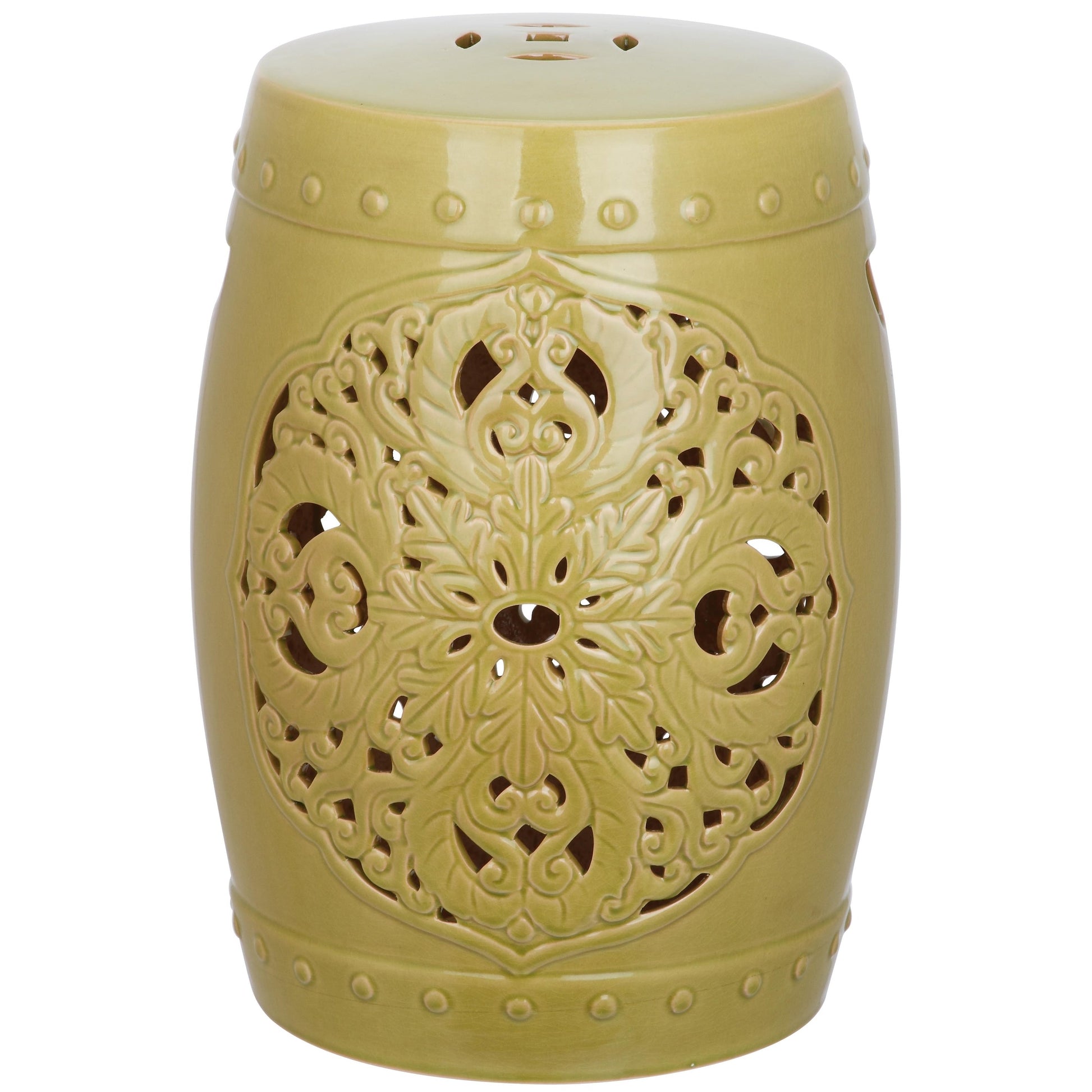 Exquisitely crafted with ceramic, the Garden Stool features a pierced leaf medallion that takes its inspiration from the flowing acanthus leaves of Art Nouveau design. Replete with lucky coin top detail and faux ceramic nail heads, this piece's is a timeless beauty.