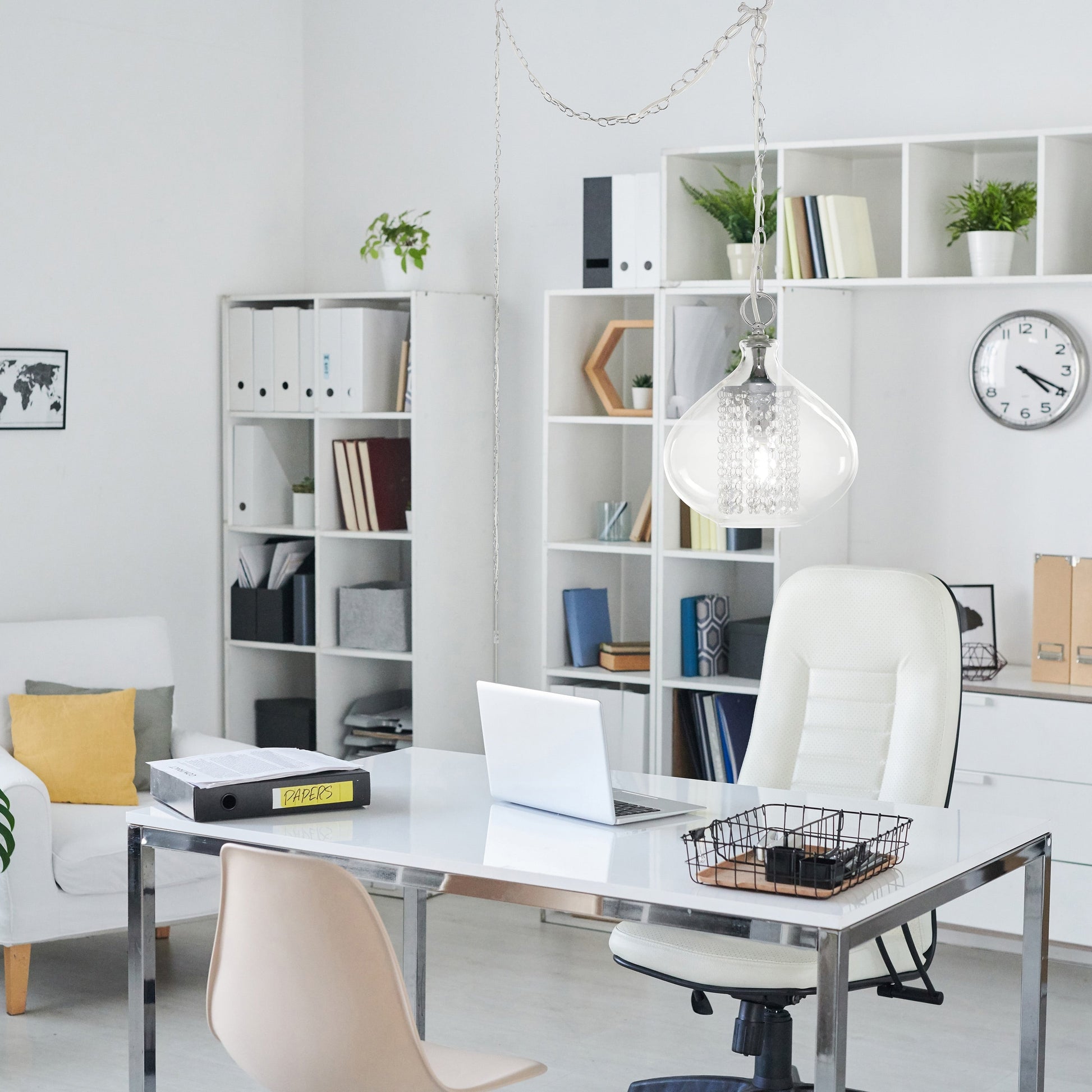 Add a touch of glamour to your home decor with Silver Orchid's Wallock hanging pendant. This stunning pendant features a hand-blown glass frame and 150 faceted K-9 crystal accents, creating a luxurious and elegant look. The smoke-colored transparent finish adds a modern touch, while the option to choose between hardwired or plug-in makes it versatile enough to fit any space.