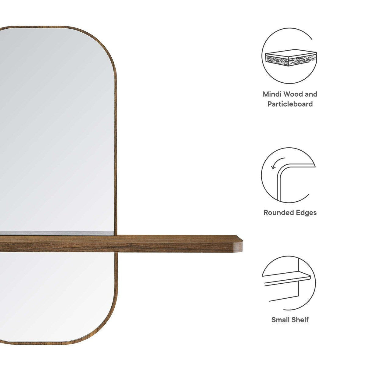 The Solstice Mirror adds an air of sophistication to any space. A good blend of contemporary and traditional styles, this rectangular mirror features rounded edges and a split design, making it the ideal decorative accent for an entryway or mudroom but also your living area, bedroom, bathroom, or vanity space. Crafted from mindi wood and particleboard with a wood grain laminate, this mirror is designed to last for years and is sure to add a touch of elegance to any interior. An added shelf is great for storing small items such as keys, personal care items, and other small accessories. With only minimal assembly required, this wall mirror is sure to be a beautiful addition to any home.