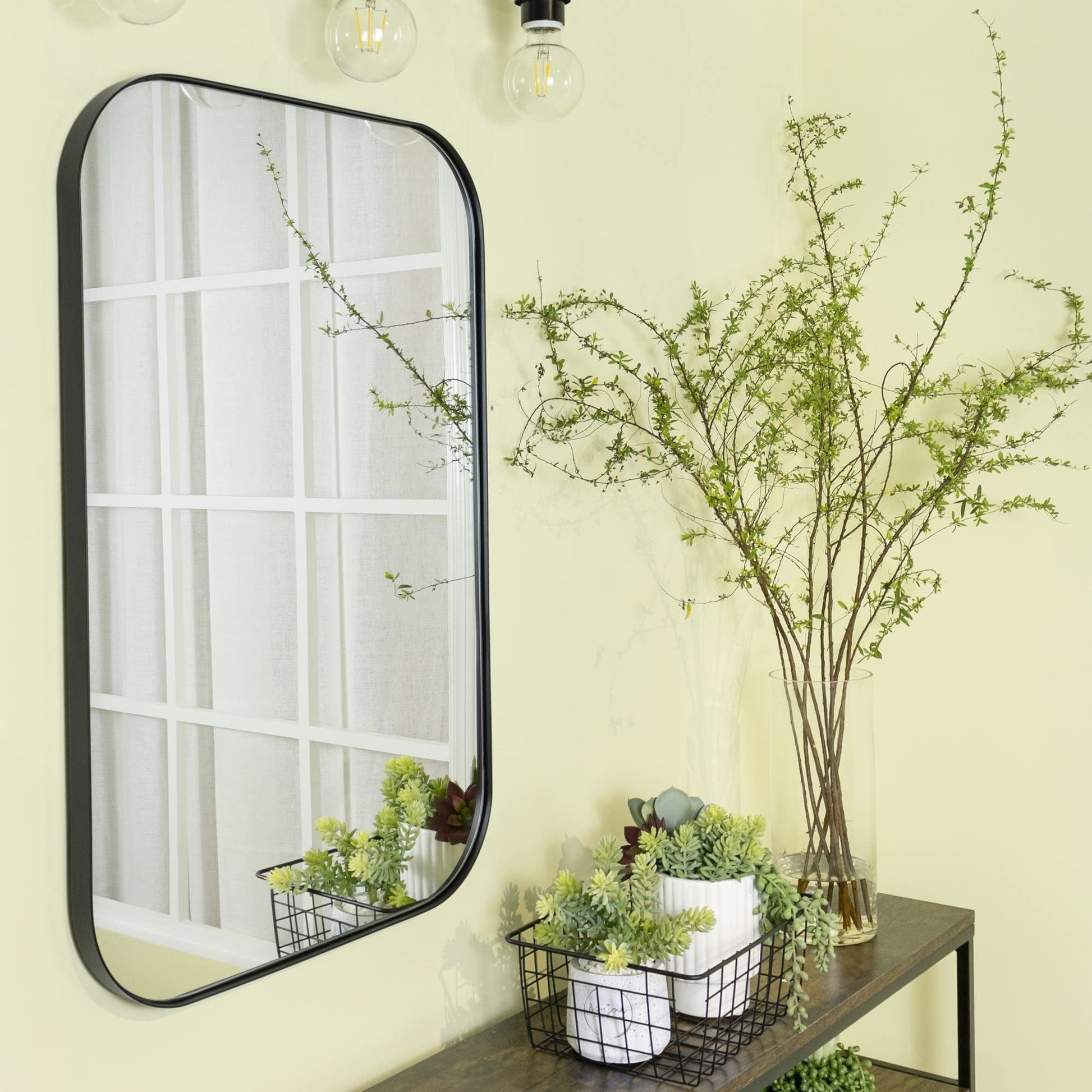 This contemporary and farmhouse style metal rectangle round corner large mirror matches any room and any decor perfectly. With the stainless steel metal framing, it is super safe to hang as a bathroom vanity mirror. Let us enhance the beauty of any room in your home instantly.