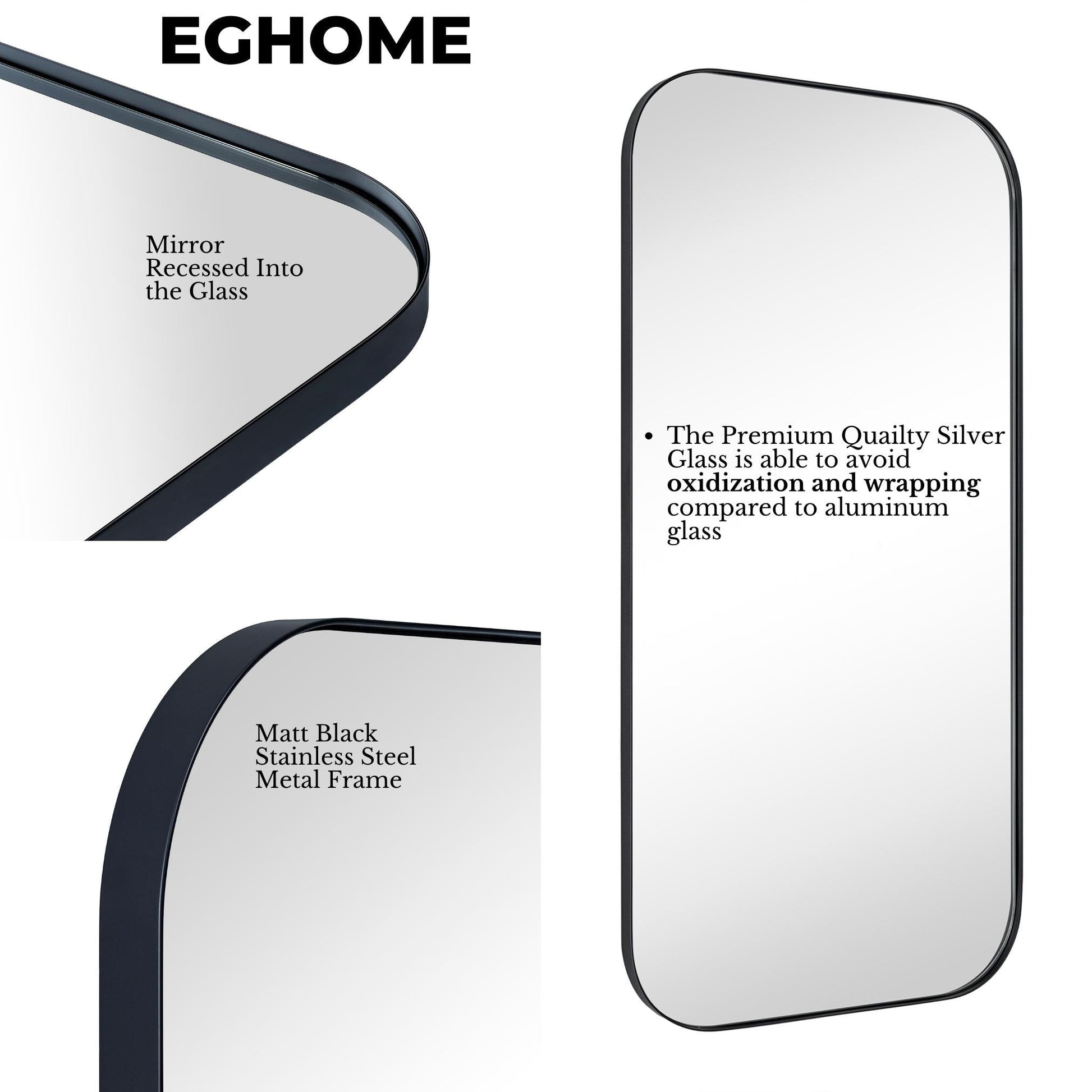 - Premium Quality Mirror Material: Our rectangle bathroom vanity wall-mounted mirror use premium 0.16'' thick silver glass (instead of 0.12'' thick aluminum glass) which is found in other lesser quality mirrors. This slight difference adds up to 3 times the total mirror cost, but this can not only make sure distortion-free but also secure oxidation FREE after years of use.