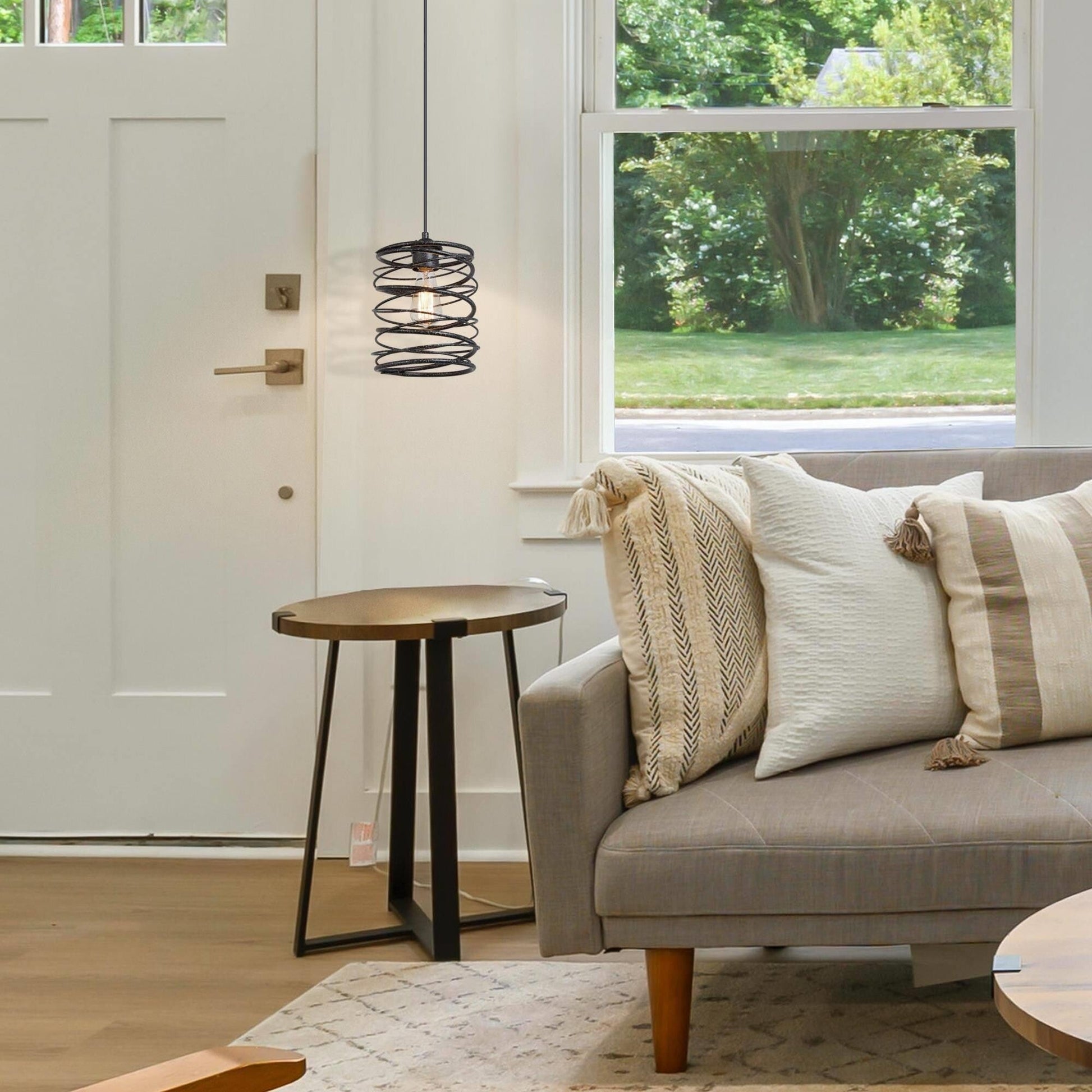 Upgrade your rustic style with this sleek single-pendant light. The cylindrical metal shade features a farmhouse, overlapping spiral design that encases a single light socket. Available in a stylish black or rustic finish, this pendant light includes an adjustable chain for customized hanging height. Dimmer-compatible and UL-listed for indoor use, this fixture is easy to install and adaptable to sloped, flat, or vaulted ceilings.