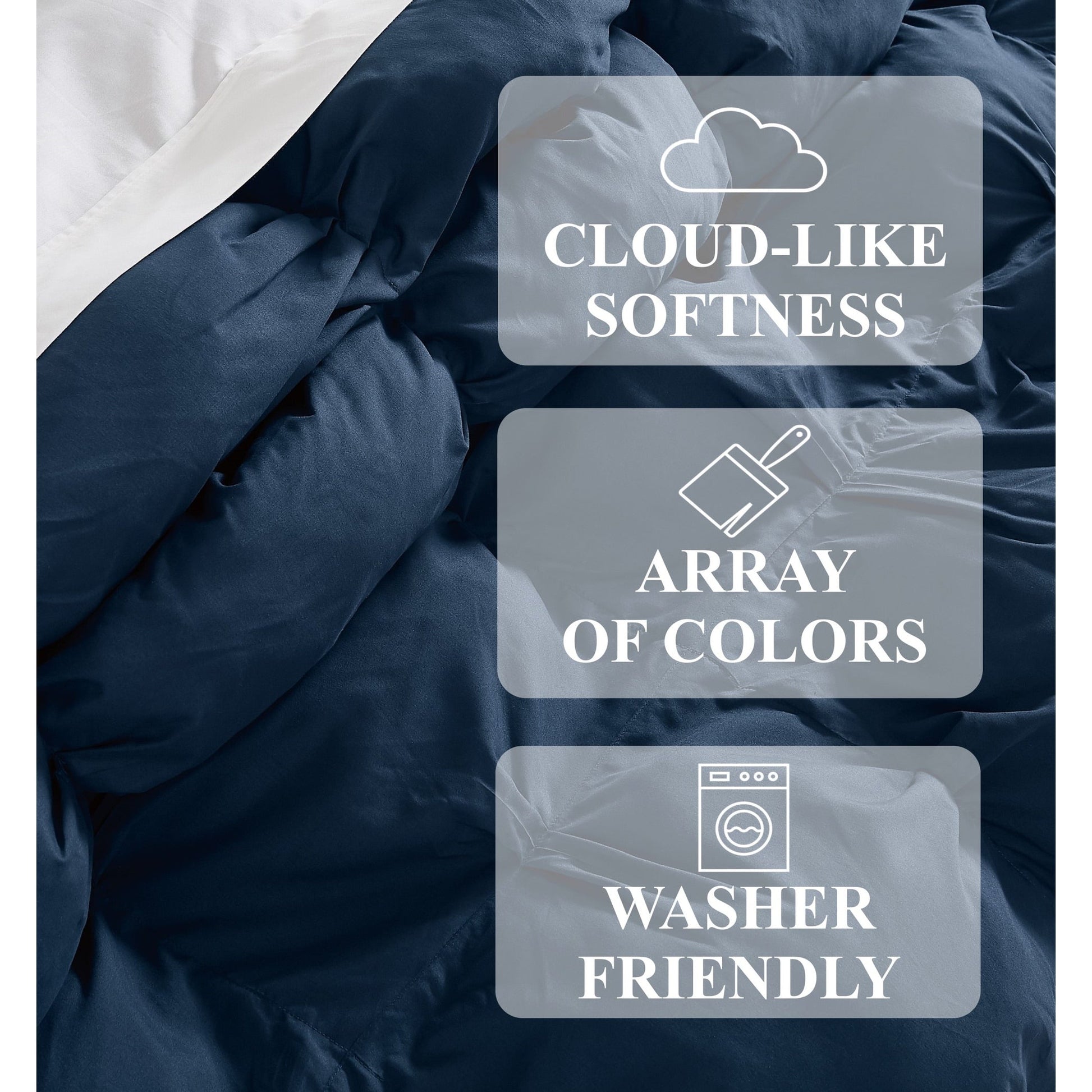 - Queen: Includes one comforter (98'W x 90'L) and two standard shams (26'W x 20'L)