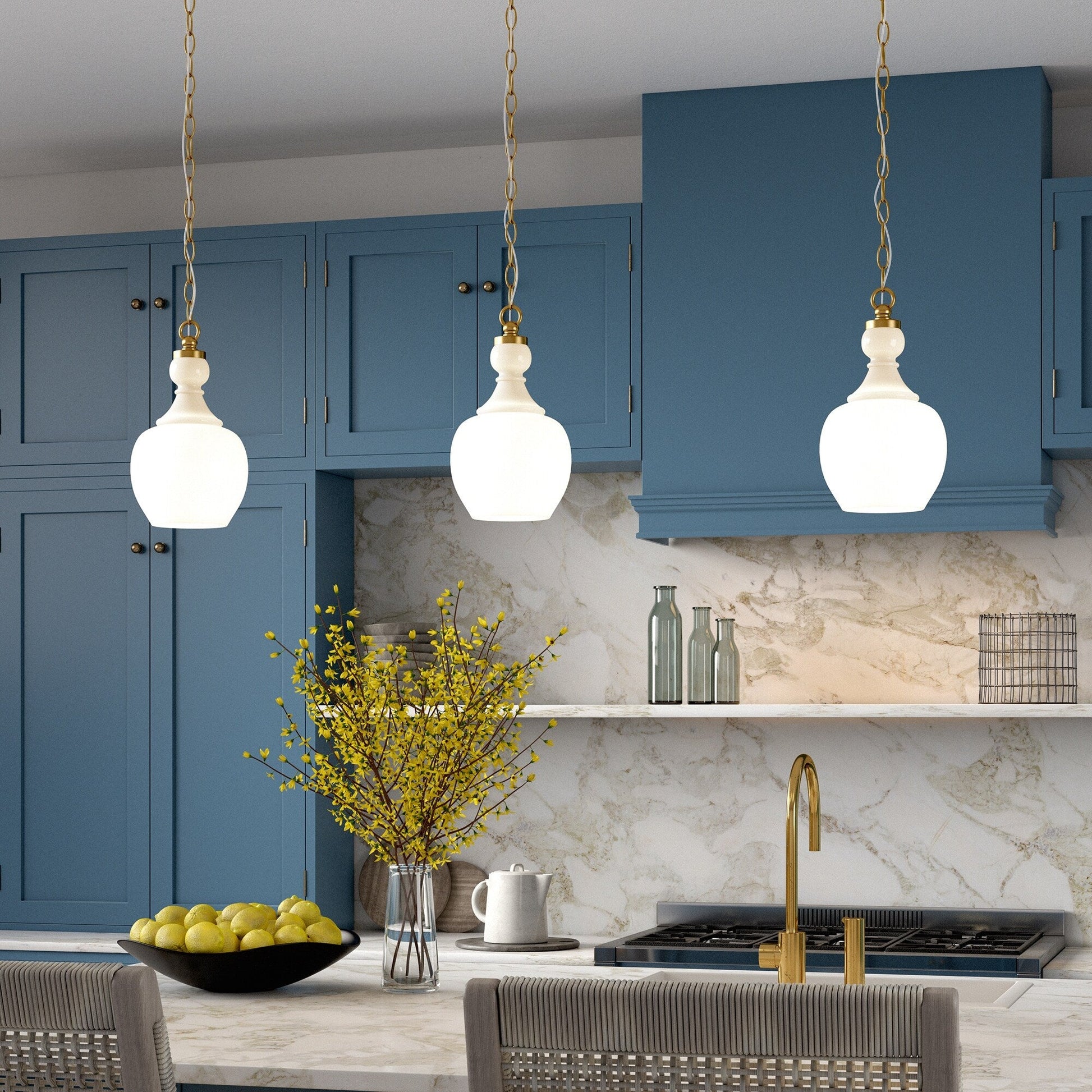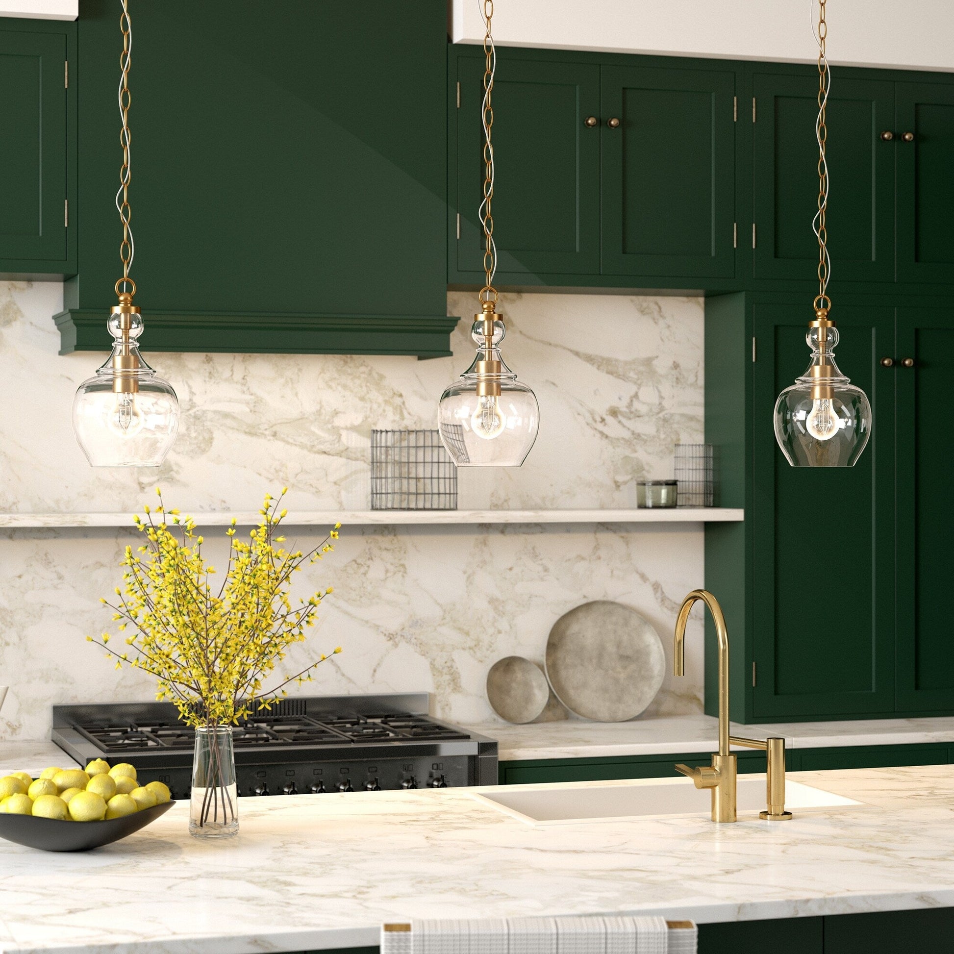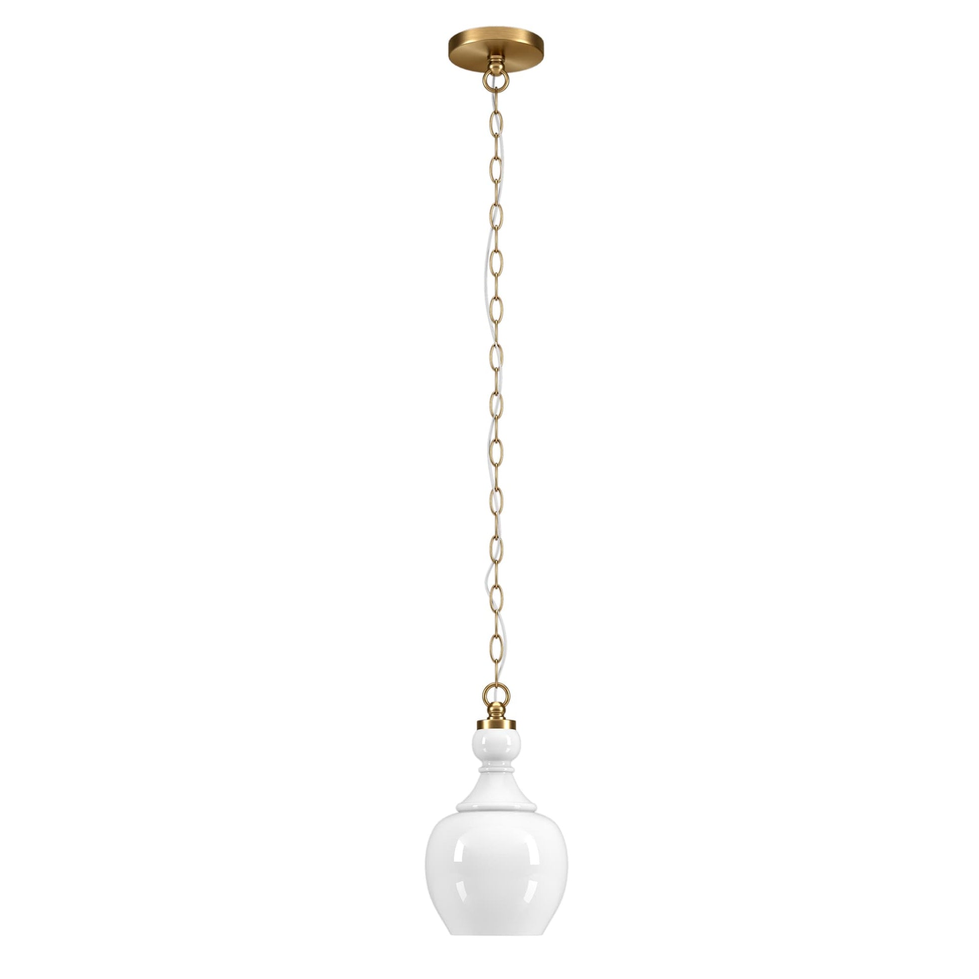 - Domed glass shade paired with warm metallic accents