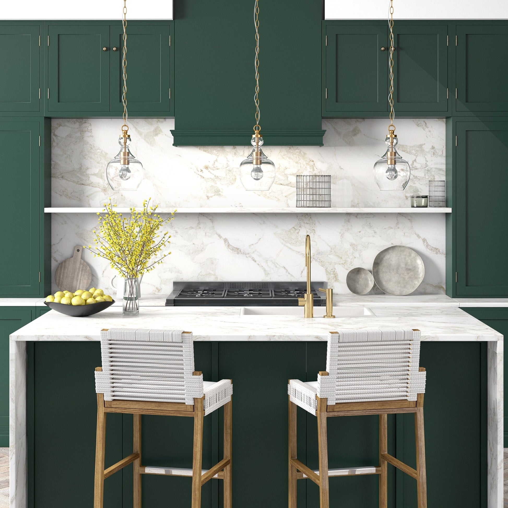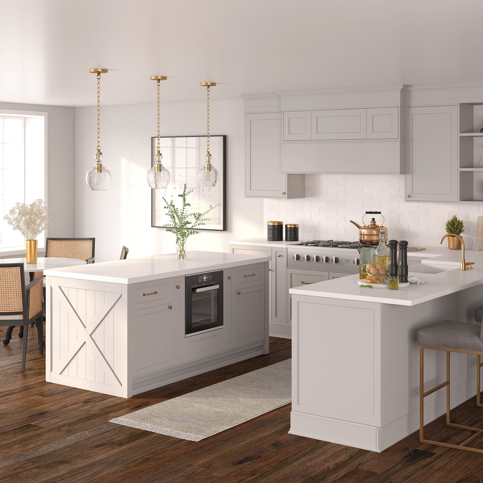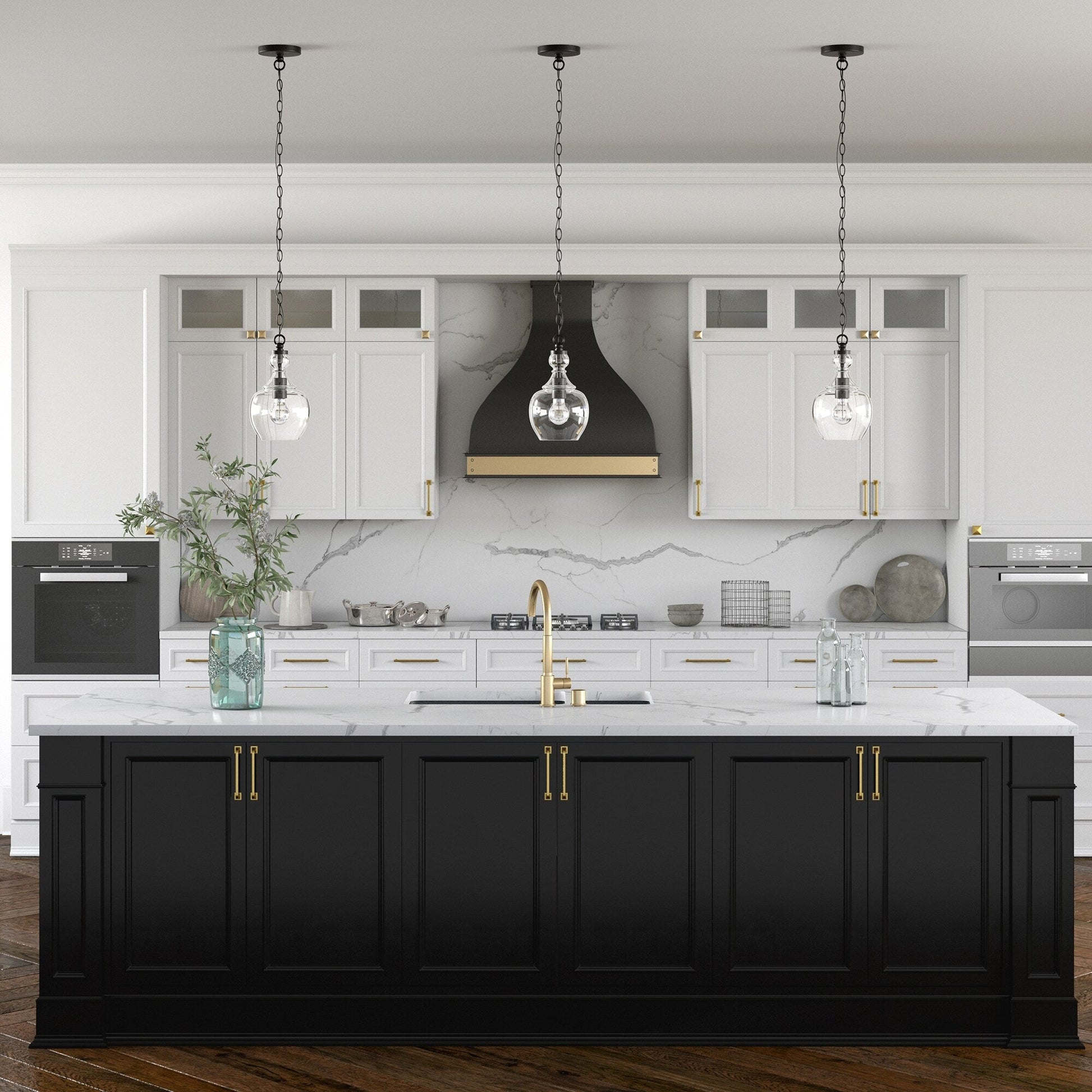 - Domed glass shade paired with warm metallic accents