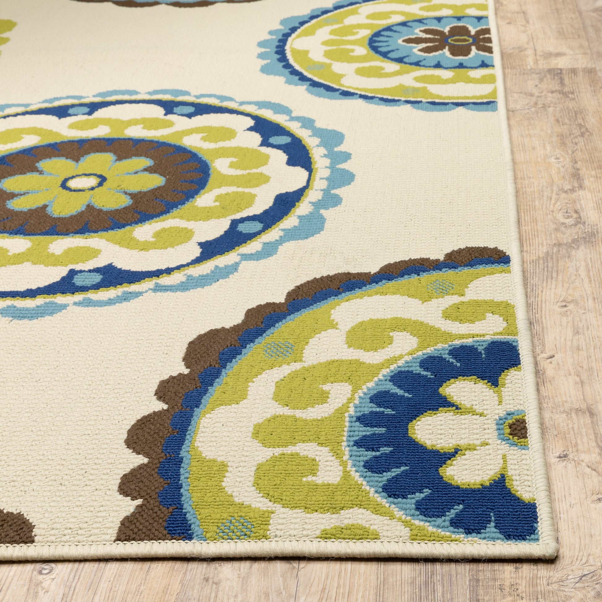 Bring a touch of bohemian style to your indoor or outdoor space with this contemporary medallion rug. Power-loomed from durable polypropylene, it features shades of ivory, green, brown, and blue that are weather-resistant and perfect for high traffic areas. The low flat loop pile height makes for easy cleaning and the rug is backed by polypropylene for extra durability. Add personality to your patio with this invigorating rug.