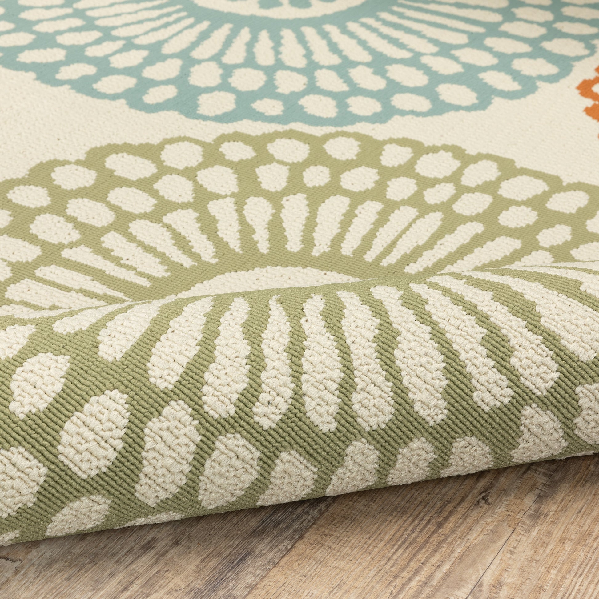 Add a pop of color to your indoor or outdoor space with this durable and vibrant rug. The ivory background boasts a lively geometric pattern in shades of beige, blue, green, brown, and orange. Made from 100% polypropylene, this rug is designed to withstand the elements while remaining resistant to weather, water, stains, fading, and wear. The low 0.16-in pile height is perfect for high traffic areas and makes for easy cleaning. Plus, it's antimicrobial for added hygiene.