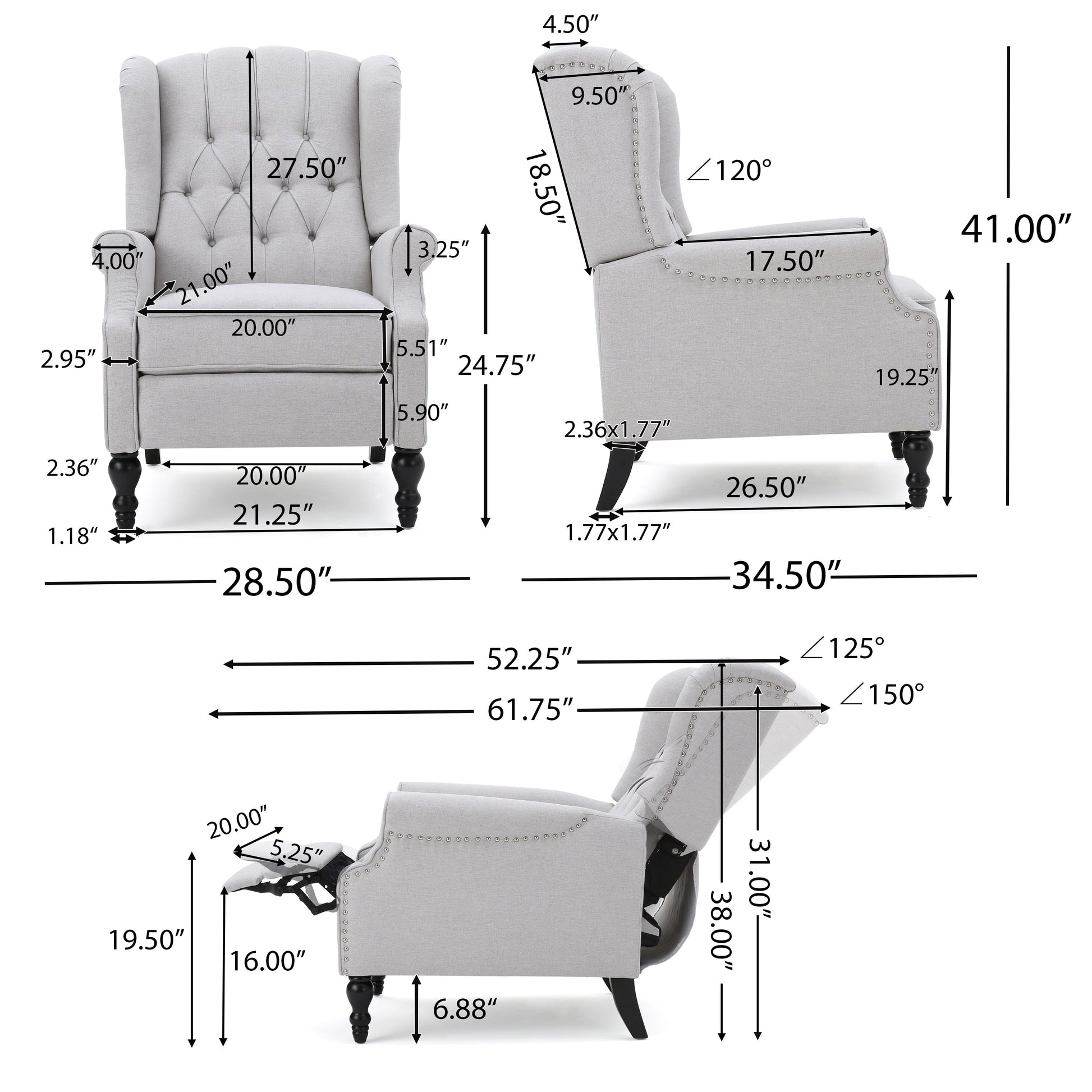 Relax in style and comfort with the Walter Tufted Fabric Recliners, a set of two chairs that exude both elegance and sophistication. These recliners are designed with a push-back recline mechanism and an adjustable footrest, making it easy to unwind after a long day. The contemporary design features smooth upholstery and tonal piping with a minimalistic yet refined structure that emphasizes both comfort and functionality. The button-tufted stitching adds an extra touch of sophistication to the backrest, while nailhead accents along the edges and rolled recessed arms complete the refined contemporary look. Choose from a variety of upholstery colors to perfectly match your decor style.